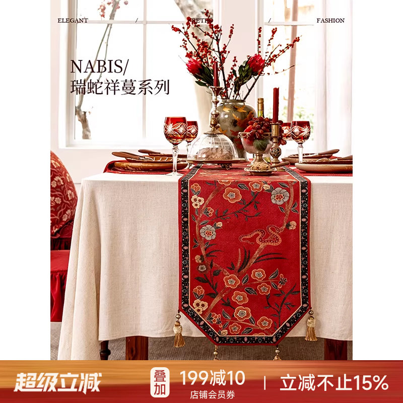 【第3件0元专区】蜡笔派瑞蛇祥蔓桌旗复古红色节日新婚餐桌布盖布