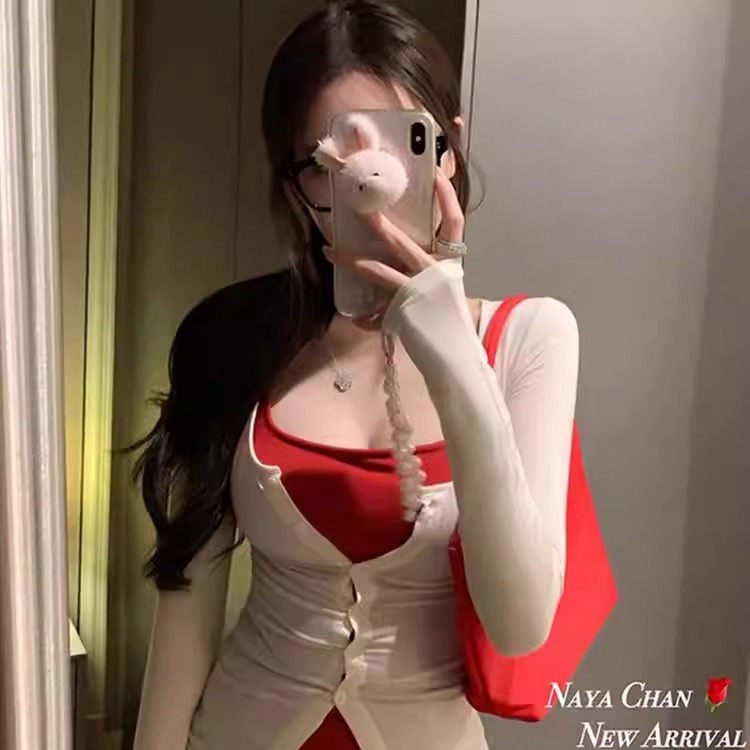 马甲线2代保暖背心秋冬磨毛蕾丝吊带女带胸垫外穿红色打底衣6100