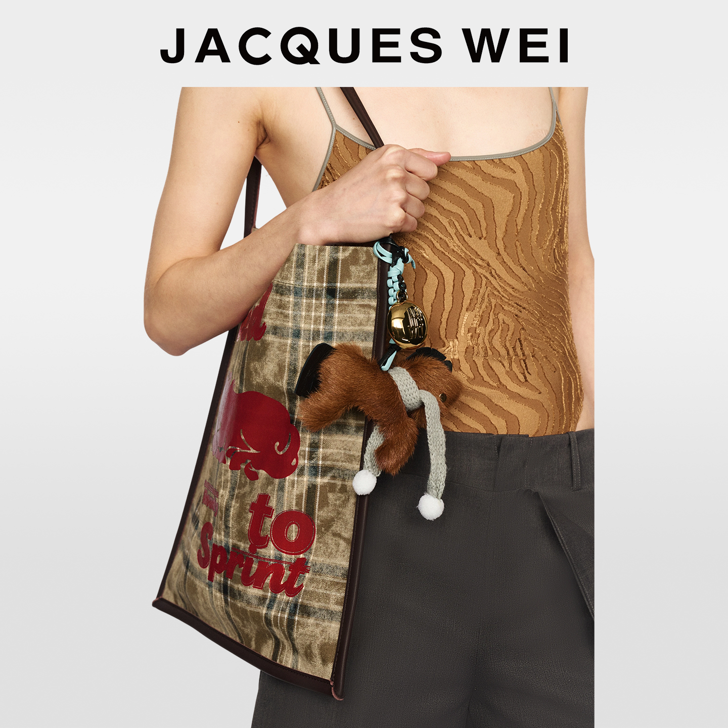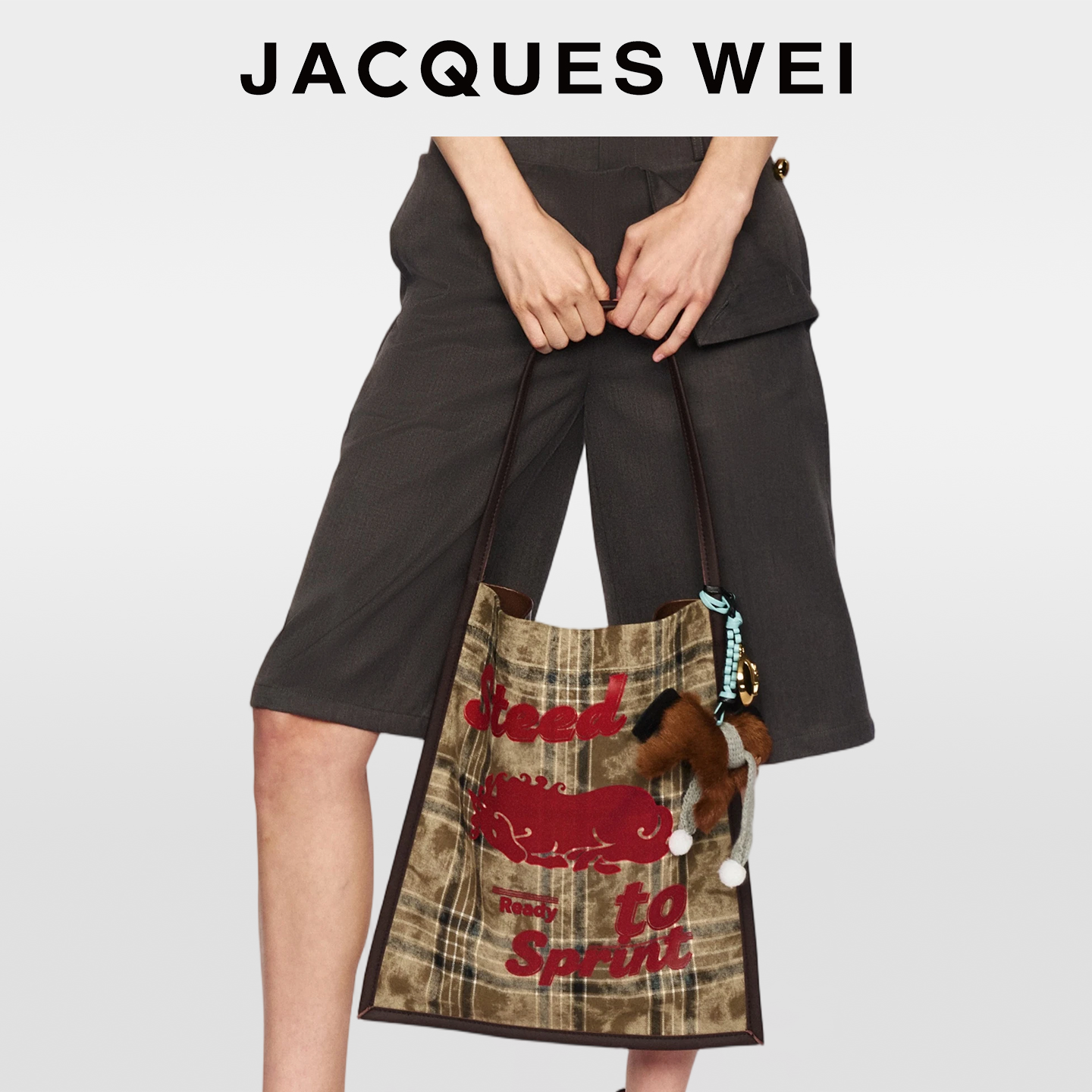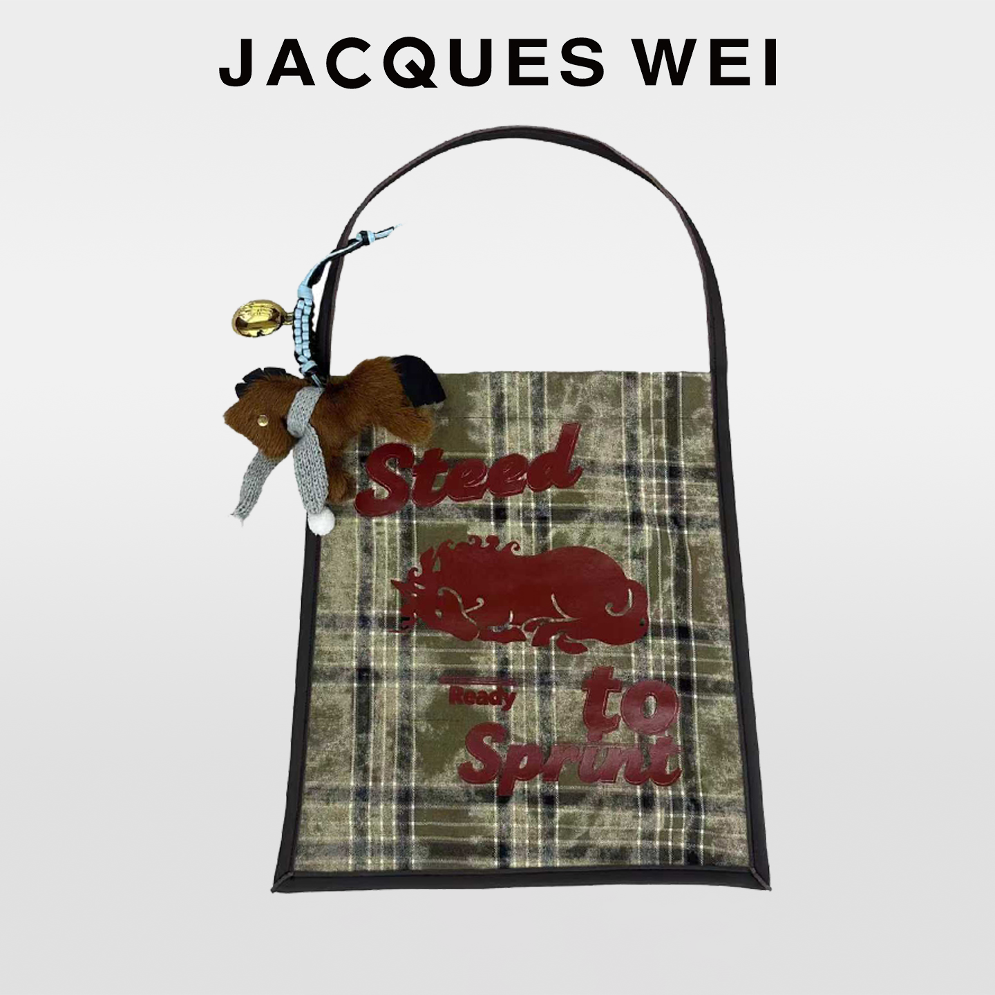 JACQUES WEI2026新年CNY小马皮草挂件墨绿格纹撞色印花做旧帆布包
