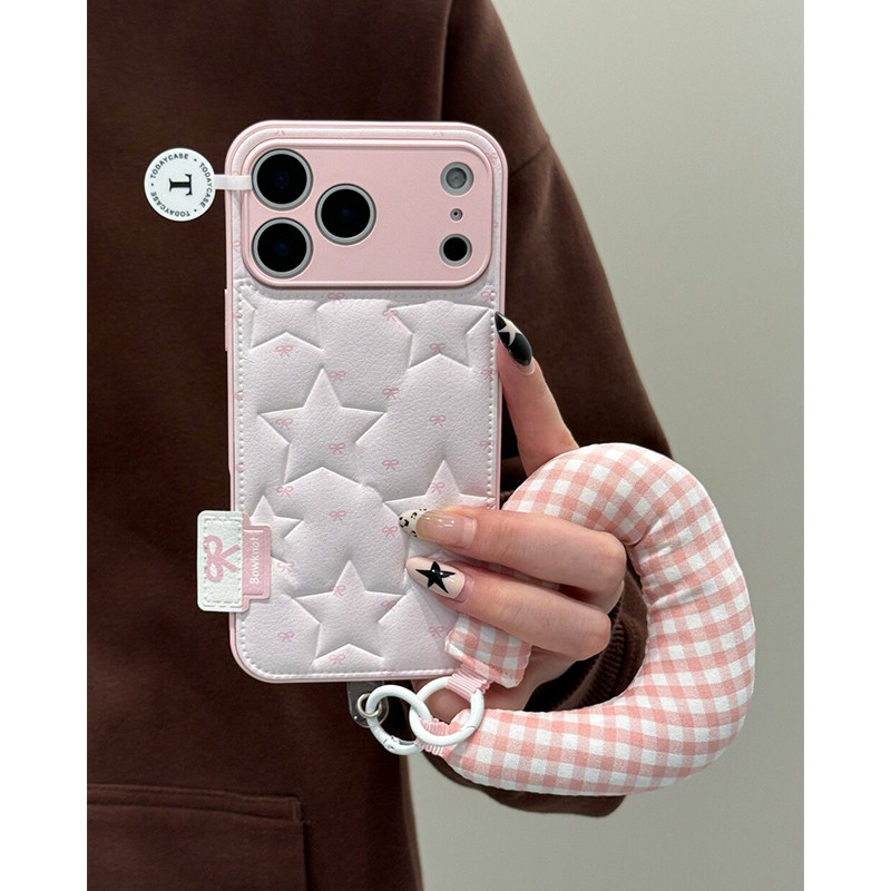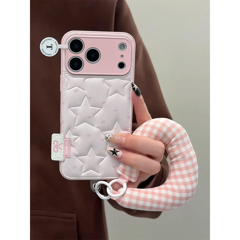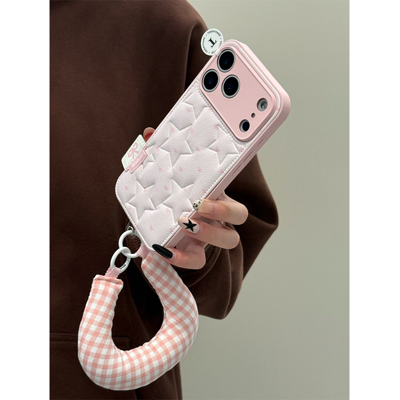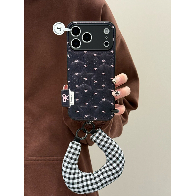 ins简约蝴蝶结带格纹手绳适用苹果17promax手机壳iPhone17女新款16皮质15韩系14全包16Pro防摔15pro保护套13