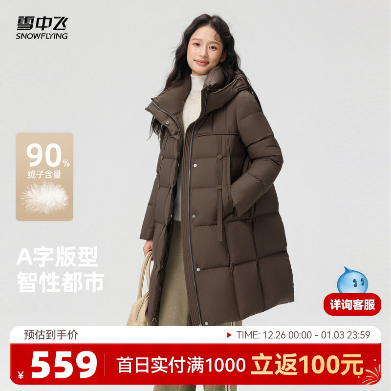 雪中飞2025冬新款女士中长款羽绒服简约通勤气质连帽保暖外套