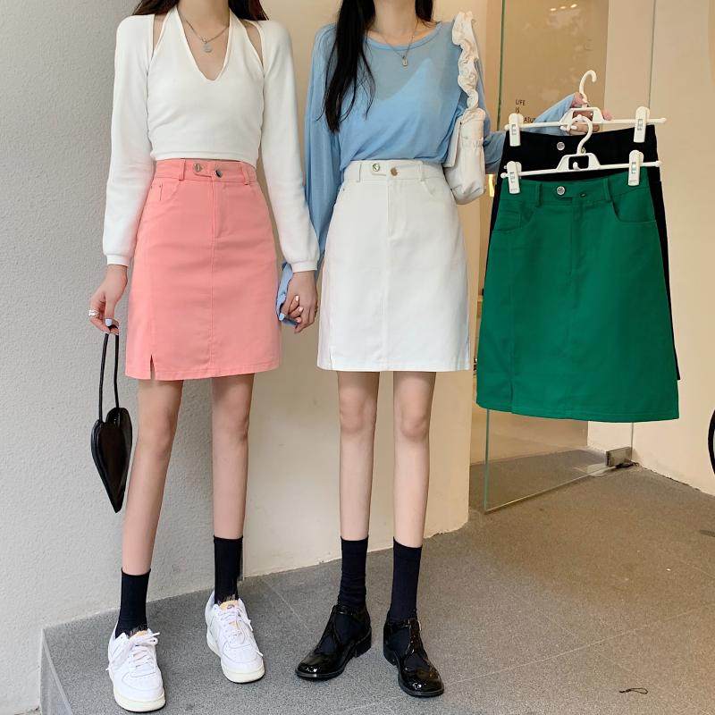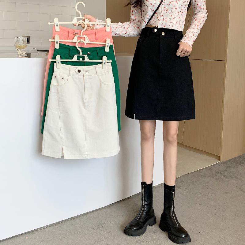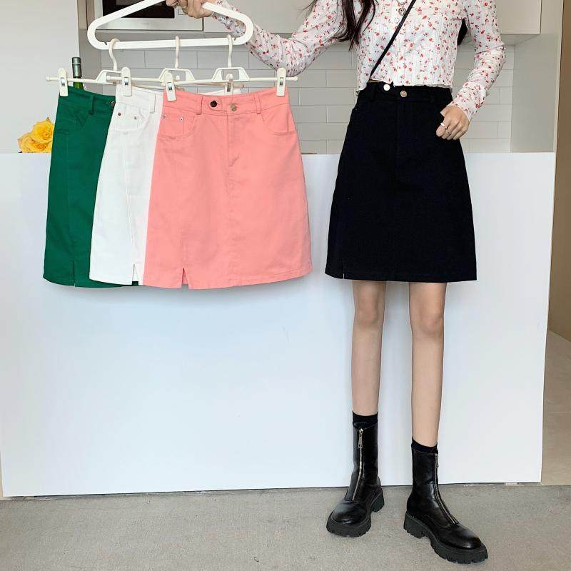 高腰开叉牛仔裙大码绿色中长裙夏薄胖mm粉色包臀A字半身裙短裙女