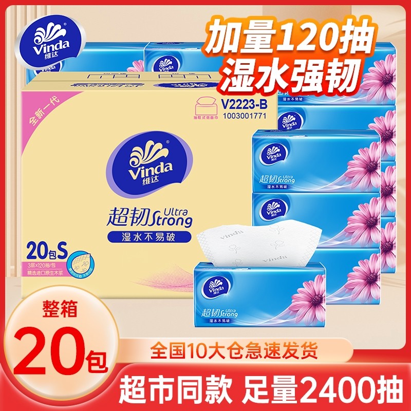 维达超韧抽纸3层120抽20包整箱装家用餐巾纸面巾纸可湿水卫生纸巾