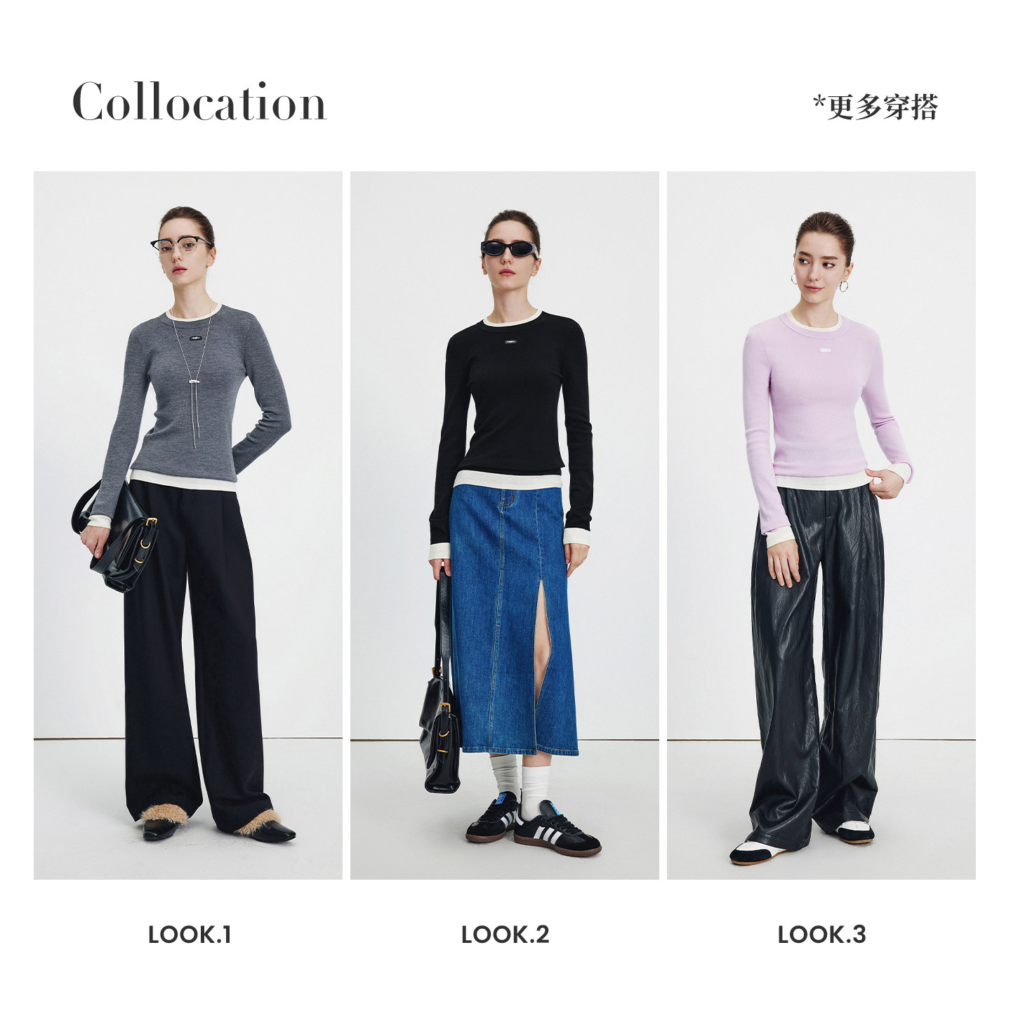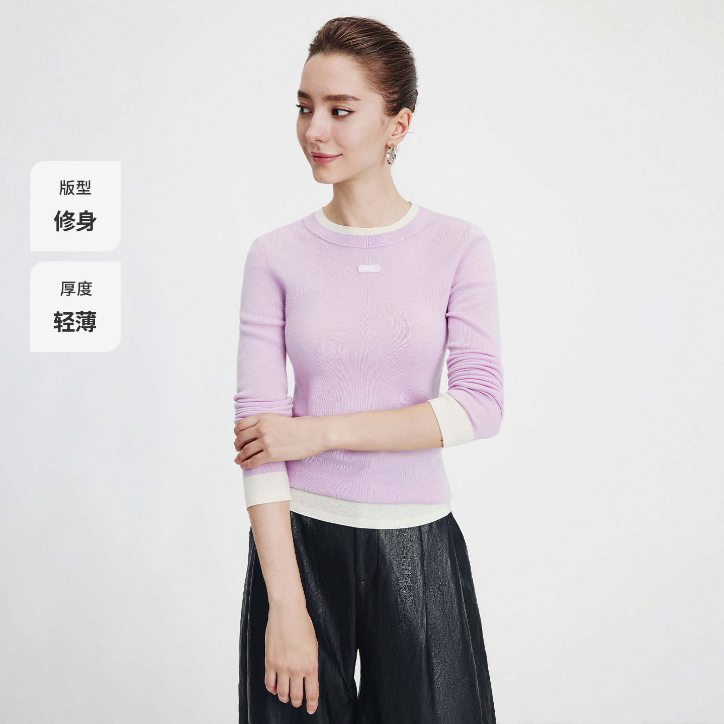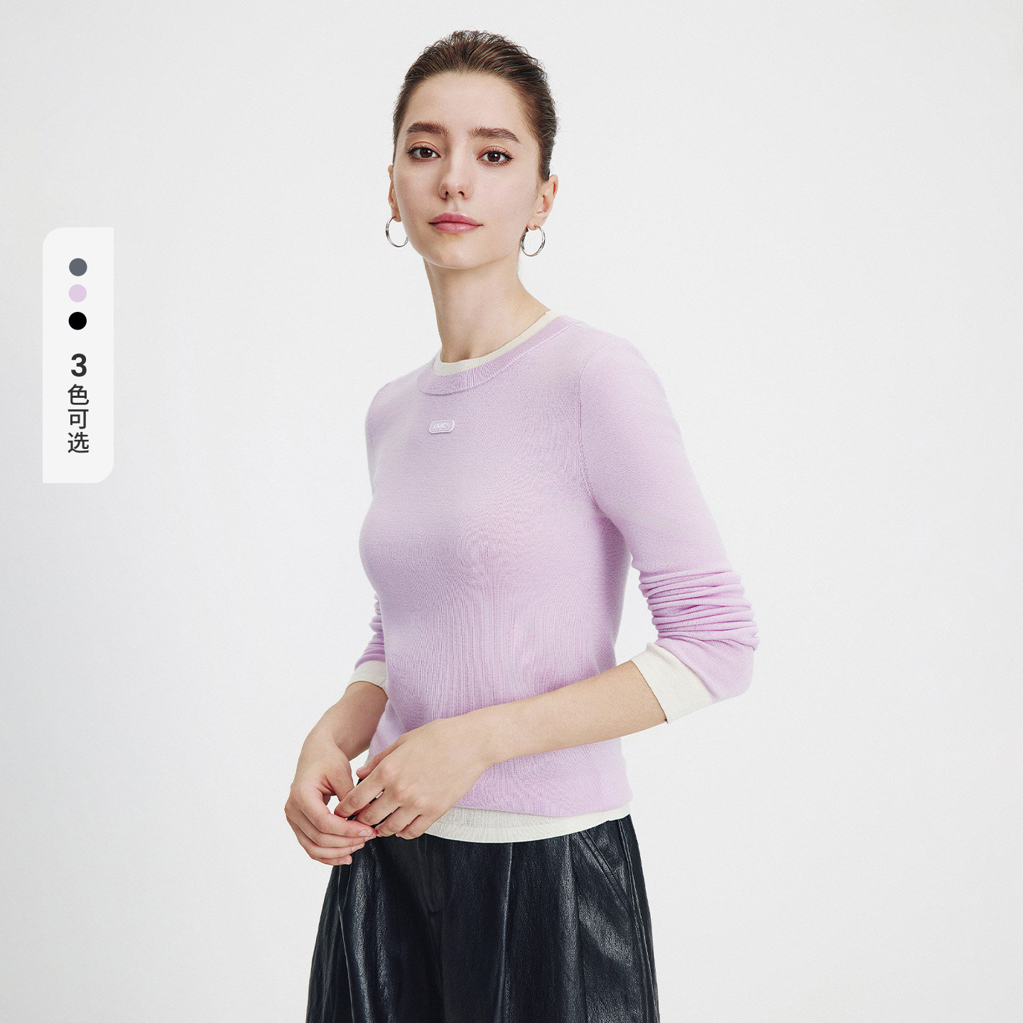 三福长袖上衣2025新款秋季圆领修身针织衫简约纯色内搭打底衫女装