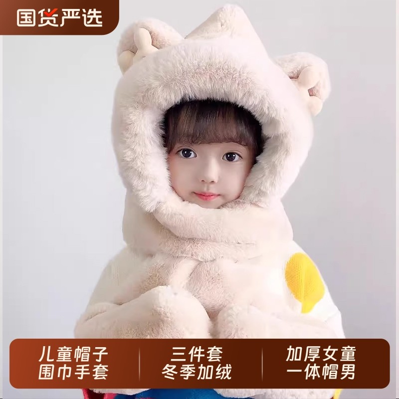 儿童帽子围巾手套三件套冬季加绒加厚女童一体帽男大童保暖防风帽