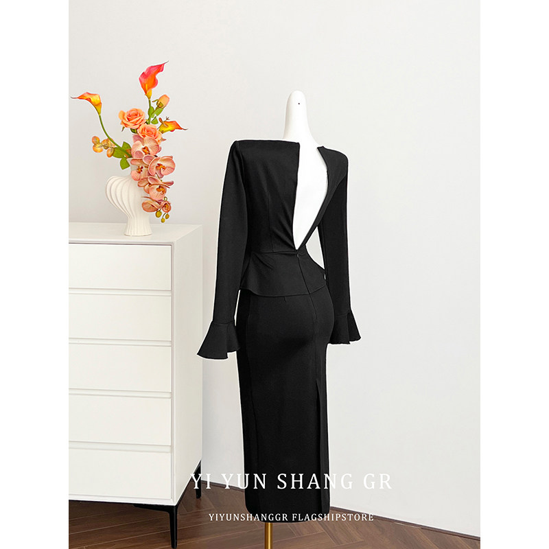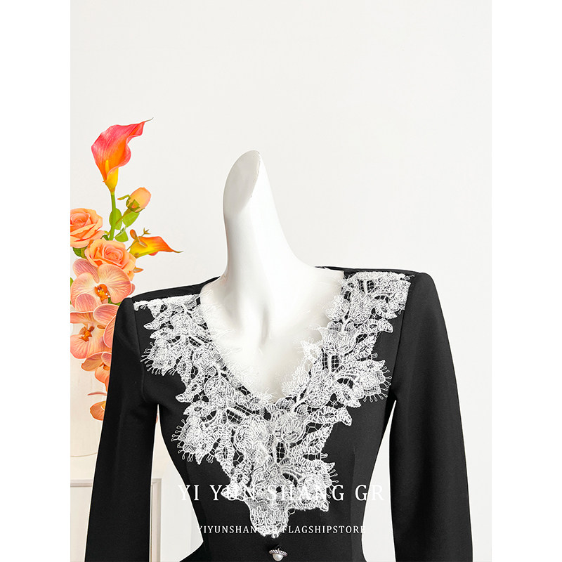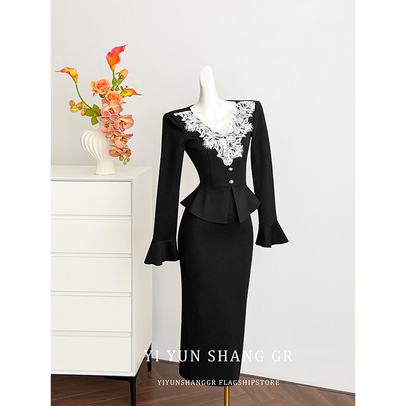 黑色复古拼接假两件连衣裙女冬季长裙重工蕾丝设计感高端礼服裙子