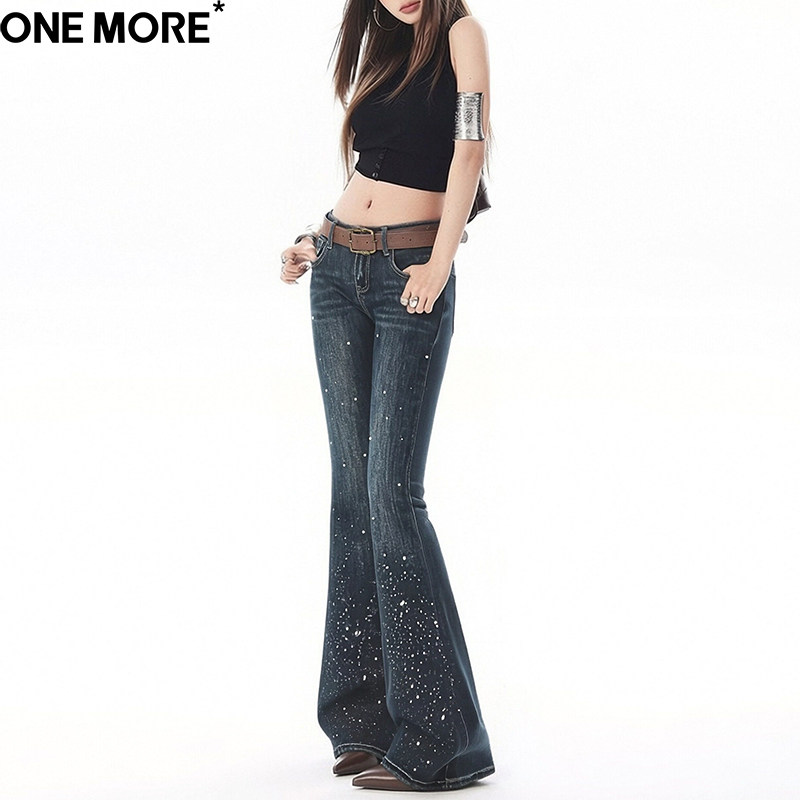 One More满天星带钻低腰微喇牛仔裤女春季新款弹力紧身显瘦喇叭裤