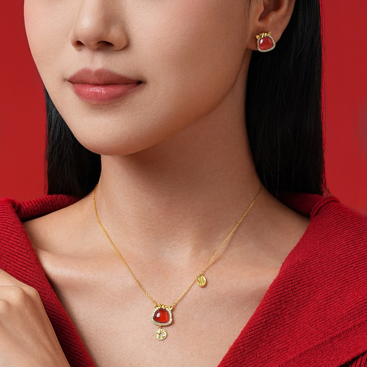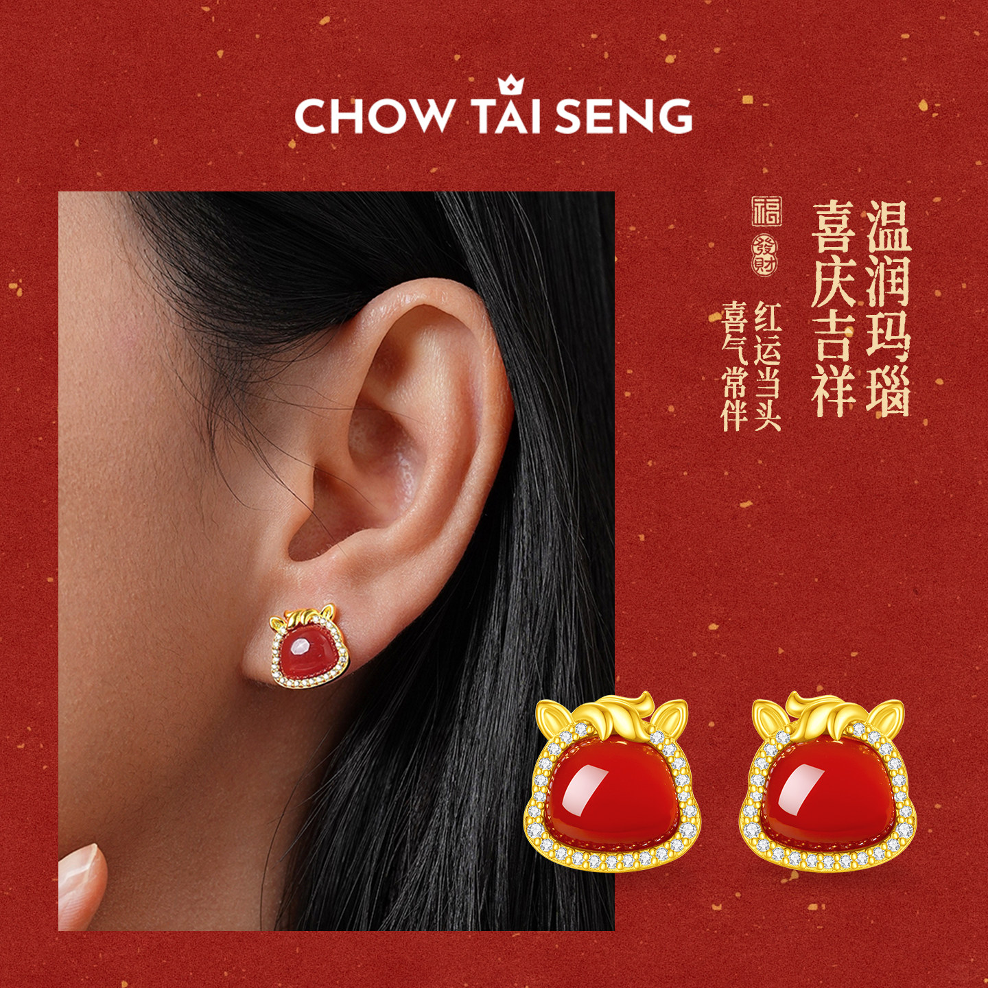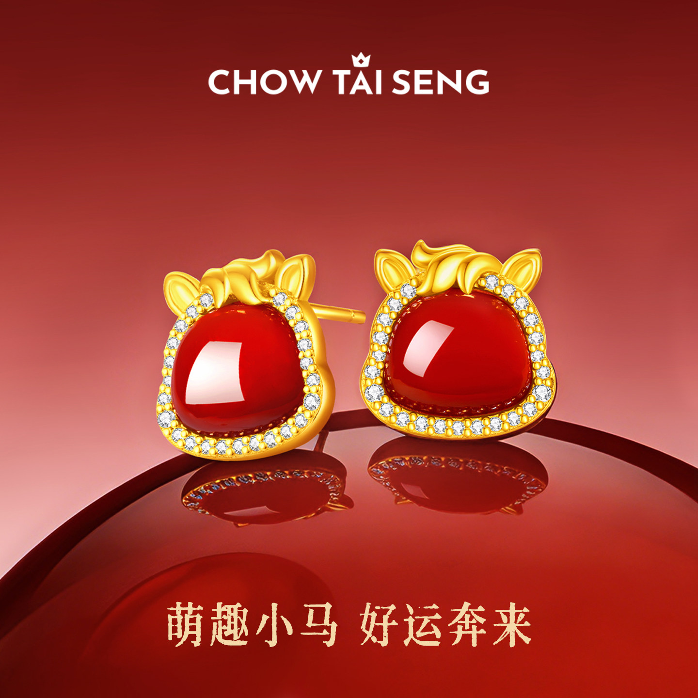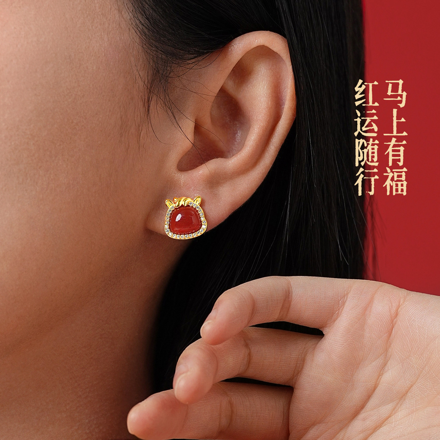 周大生红玛瑙生肖马耳钉女S925纯银耳饰设计感本命马年礼物送女友