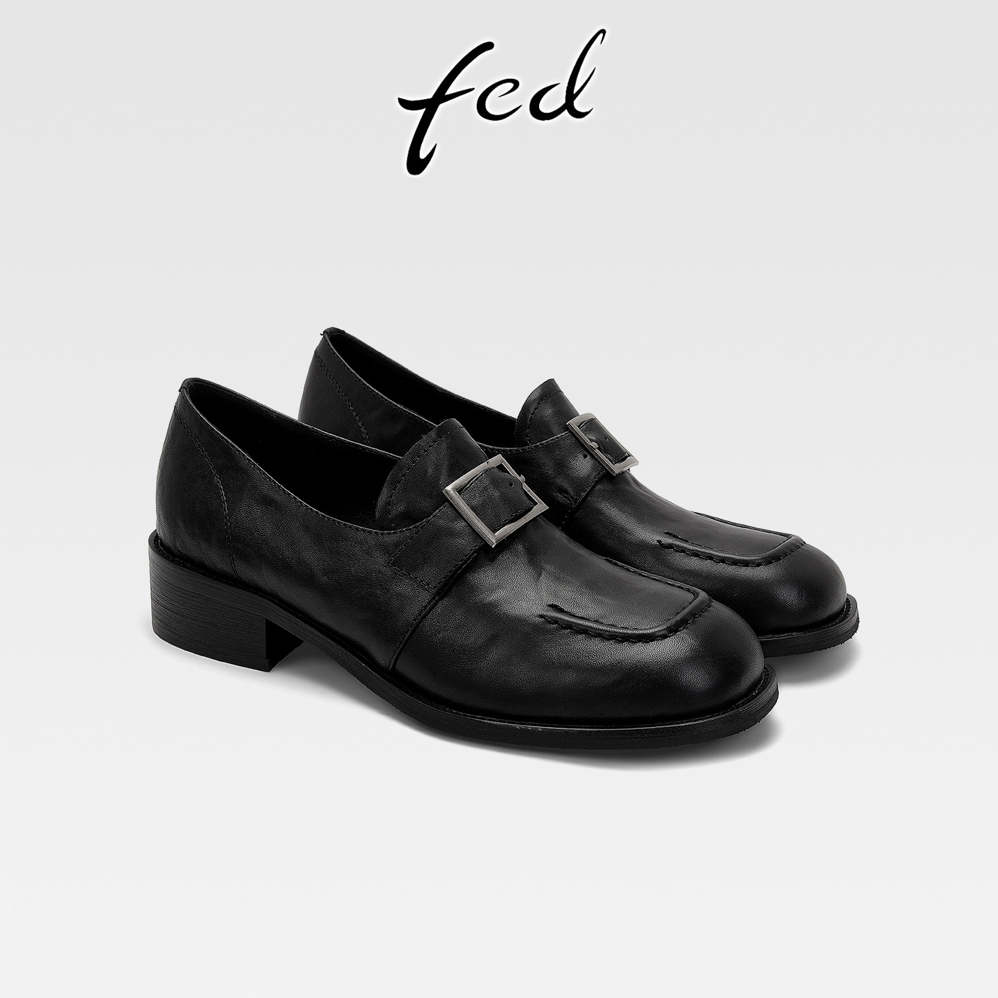 fed真皮粗跟乐福鞋女英伦风复古皮带扣小皮鞋一脚蹬圆头深口单鞋