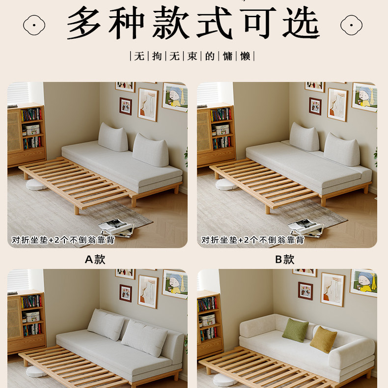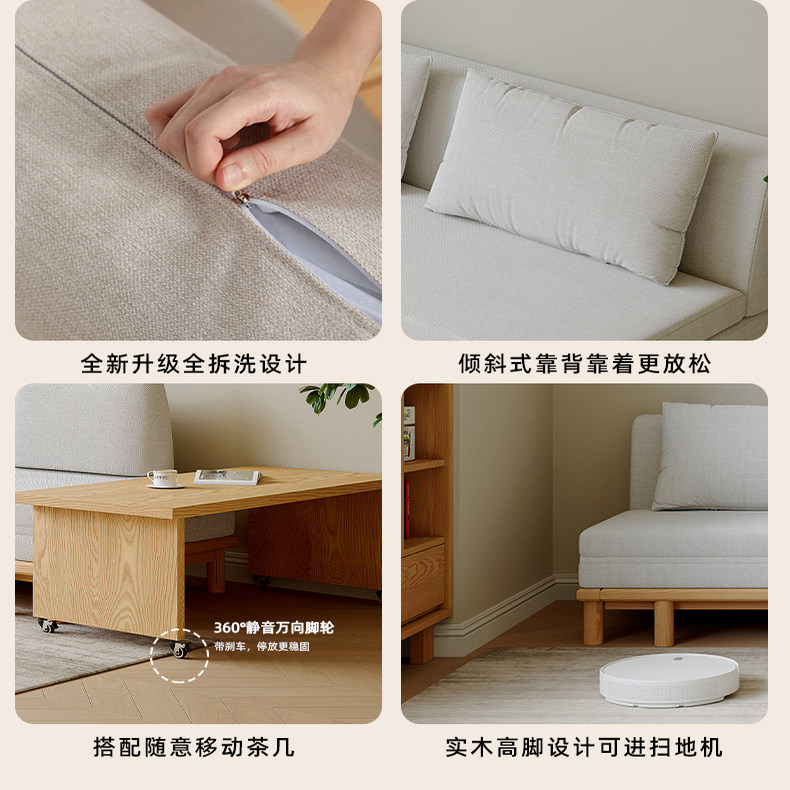 司朴原木奶油风可拆洗棉麻布艺沙发小户型客厅伸缩抽拉实木沙发床
