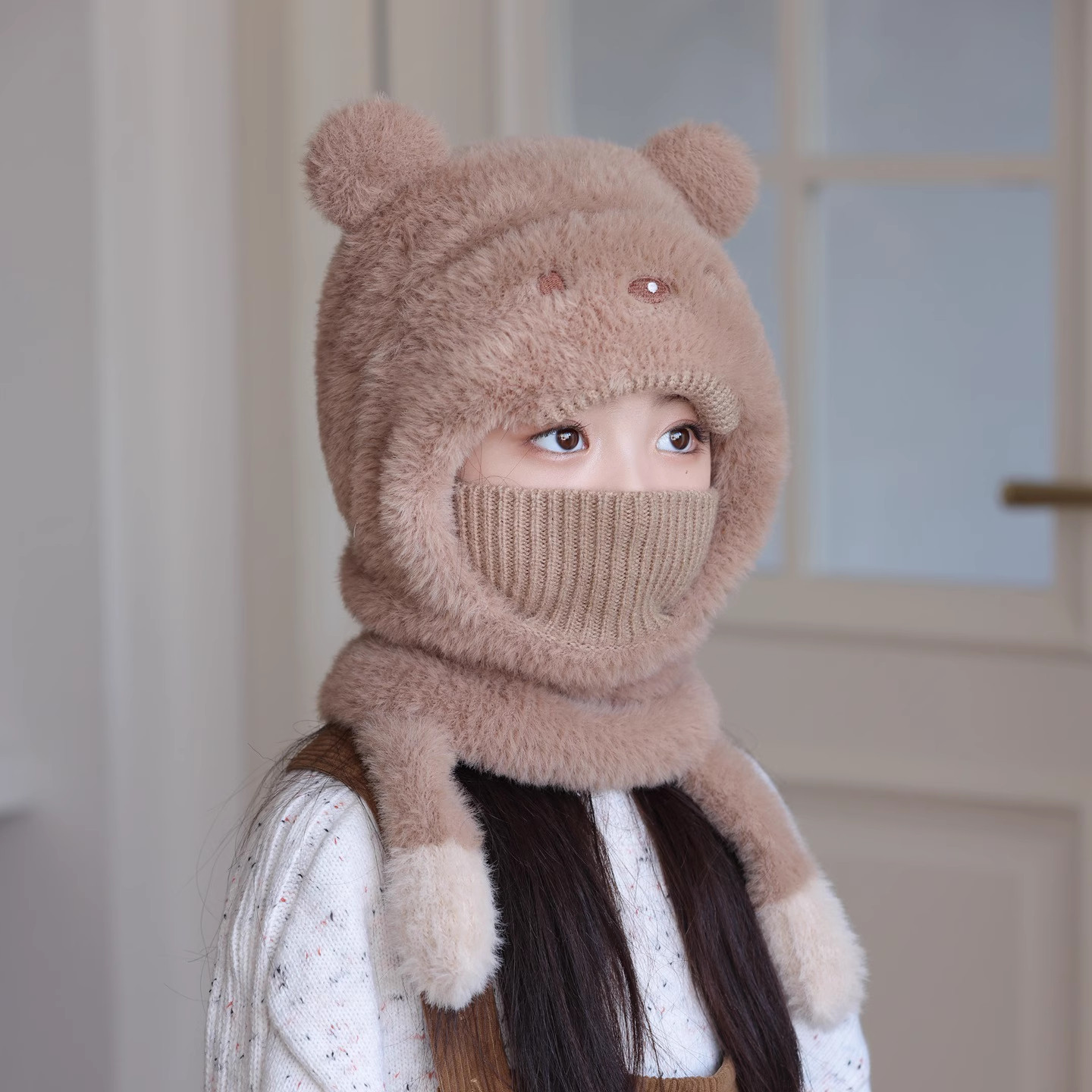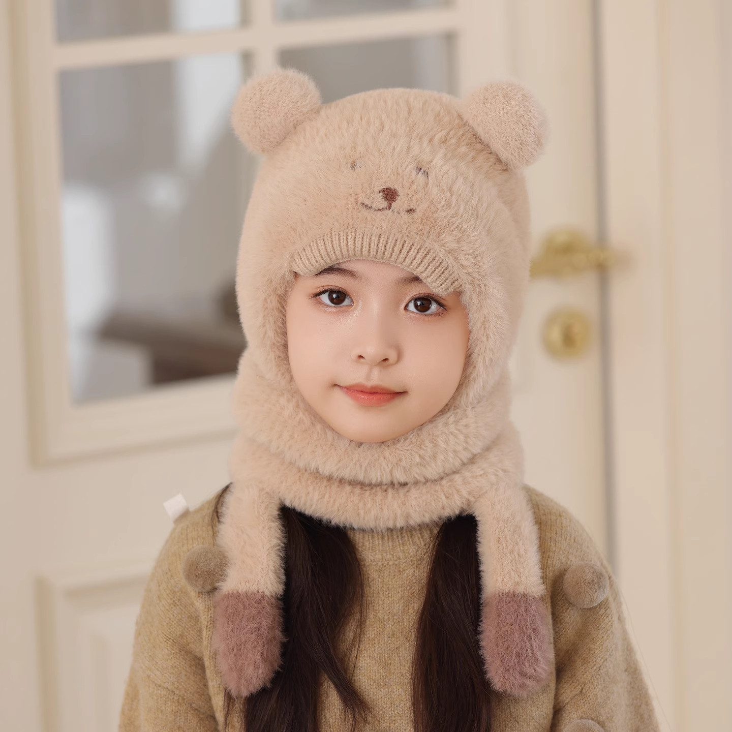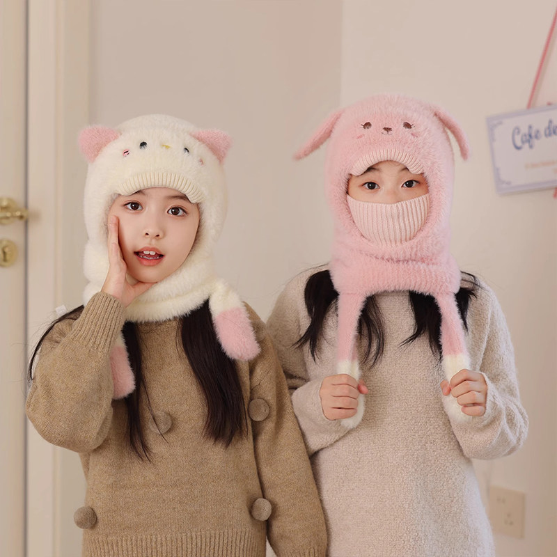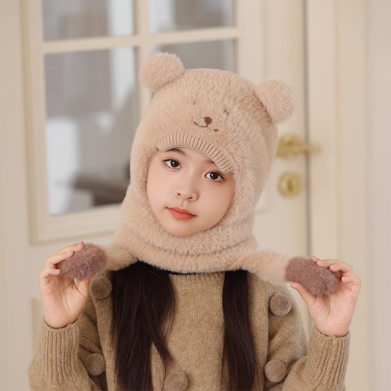 尼多熊儿童帽子围巾一体冬季防风帽宝宝毛绒护耳帽女童加厚保暖帽