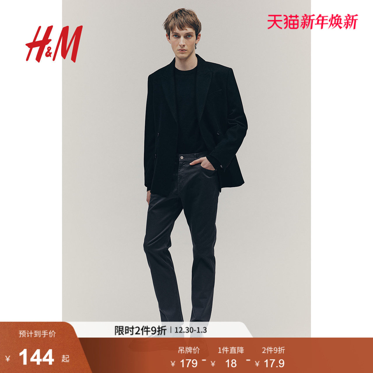 HM男装休闲裤简约柔软气质舒适合身英伦直筒斜纹布长裤1074402