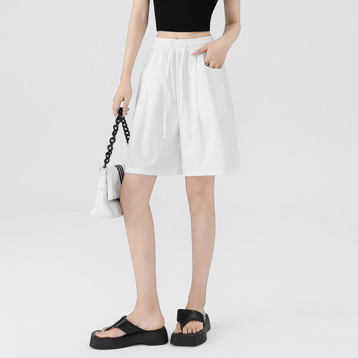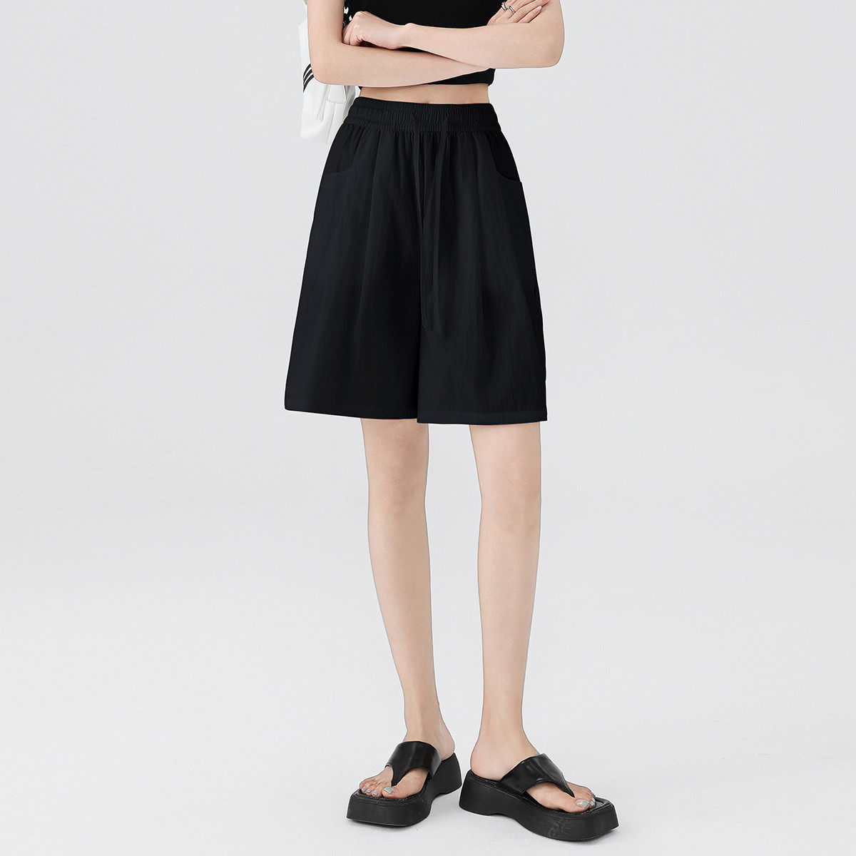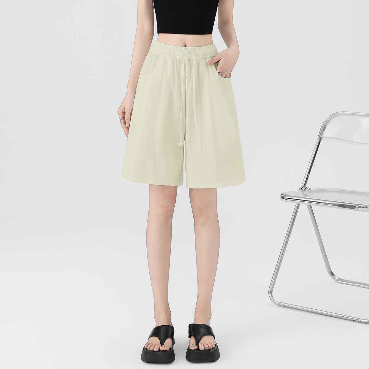 one more复古休闲五分裤女2025薄款松紧高腰通勤时尚百搭运动短裤