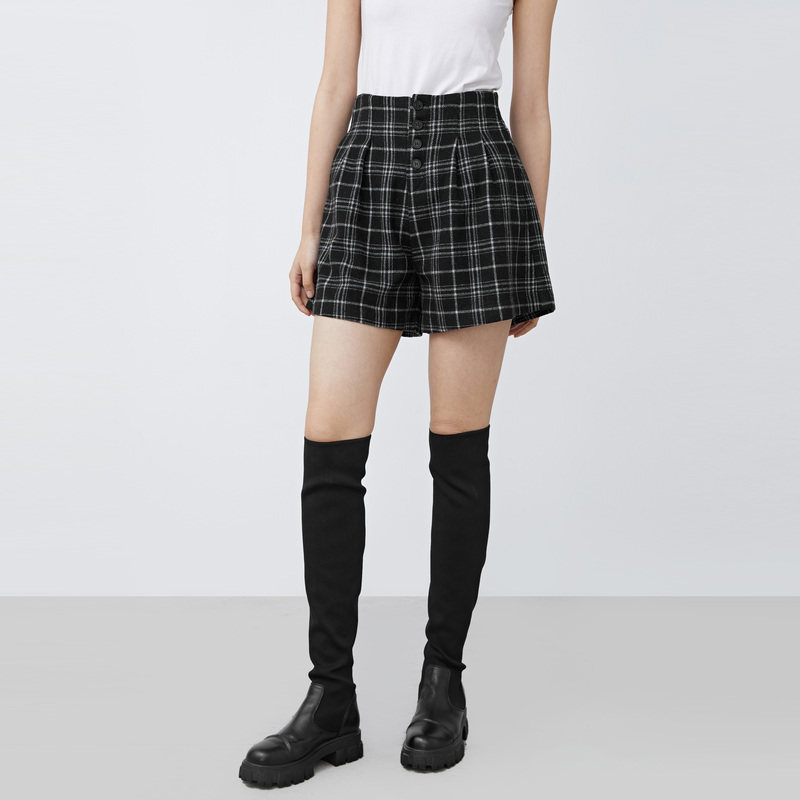 sdeer圣迪奥女装学院风高腰撞色格纹毛呢A字短裤S21480916
