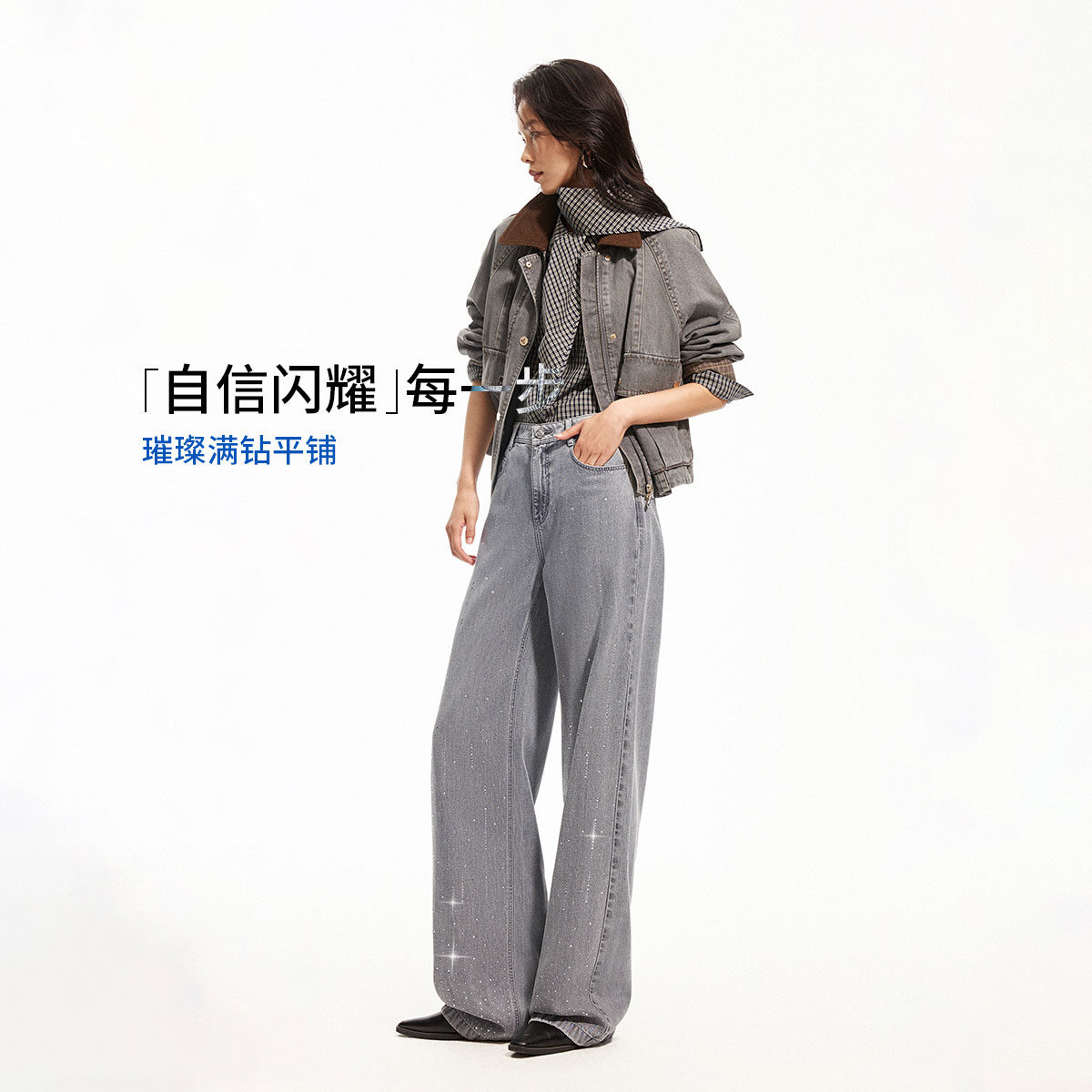 【流星裤】ONLY2026春季新款莱赛尔烫钻高腰宽松直筒牛仔裤女