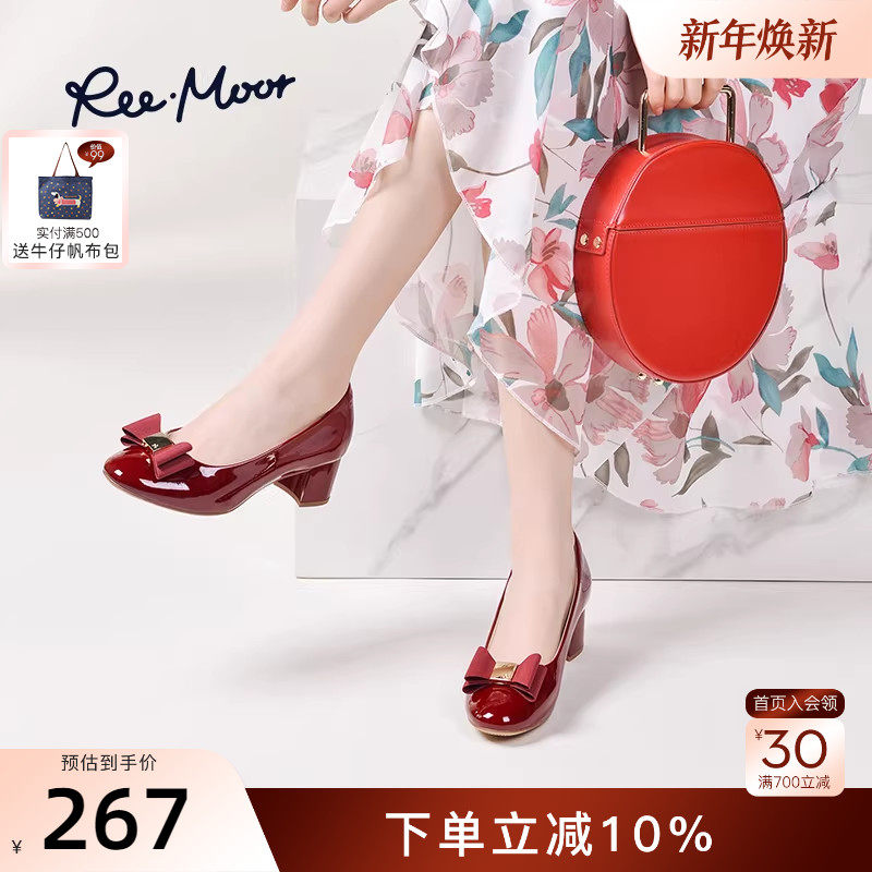 REEMOOR睿慕红色粗高跟新娘婚鞋女软底漆皮单鞋舒适气质小皮鞋