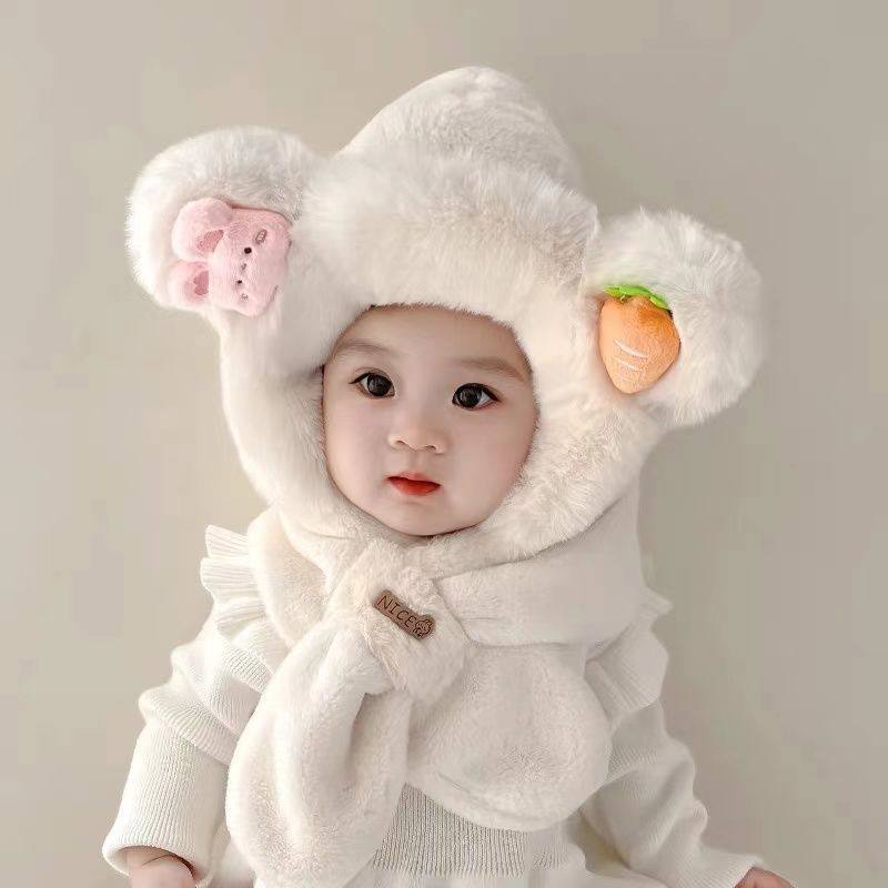 尼多熊婴儿帽子秋围脖一体宝宝毛绒帽防风护耳帽冬季保暖婴幼儿帽