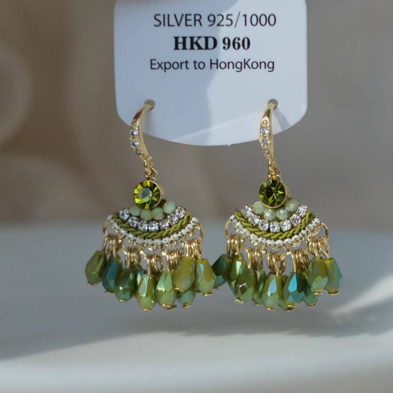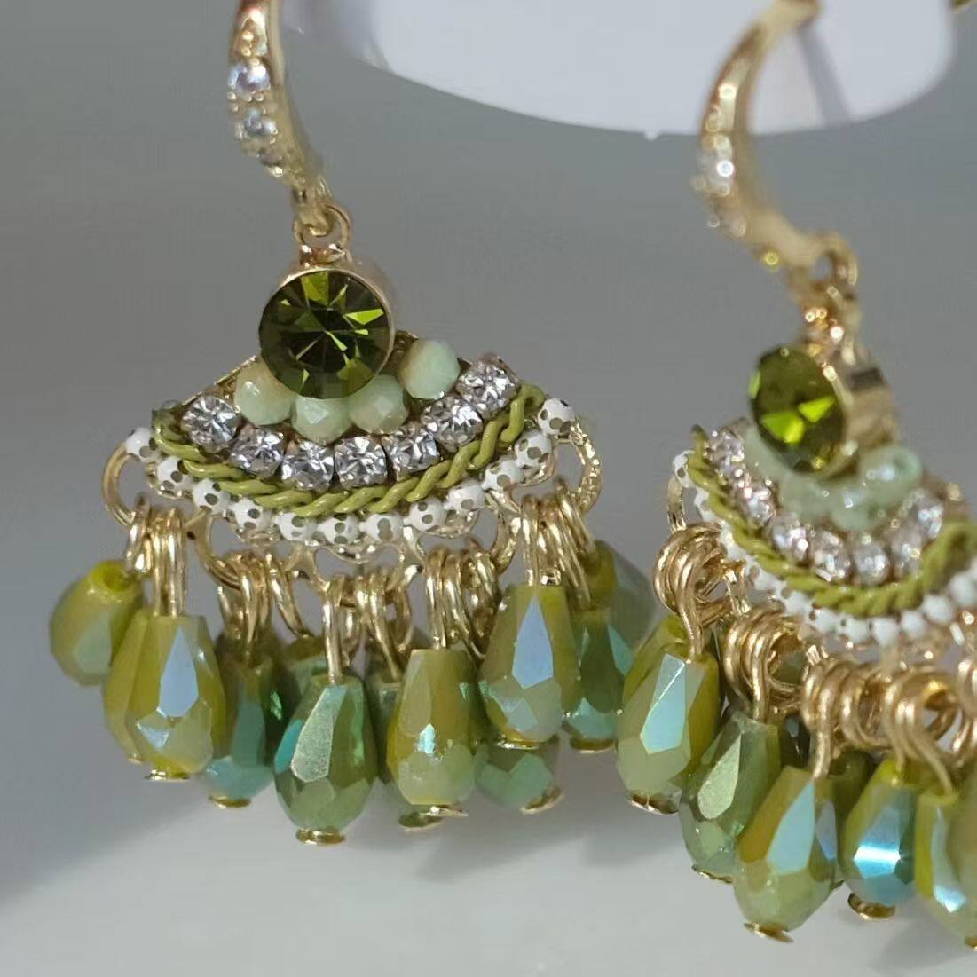 汀烟雨复古绿色流苏耳环2025新款波西米亚民族风耳饰高级感水滴