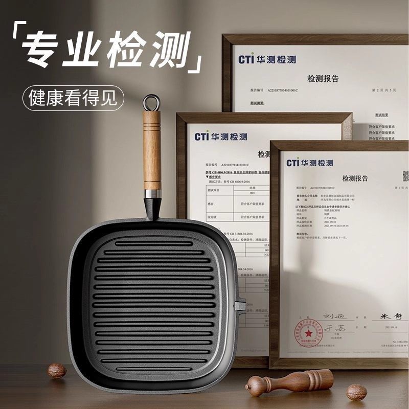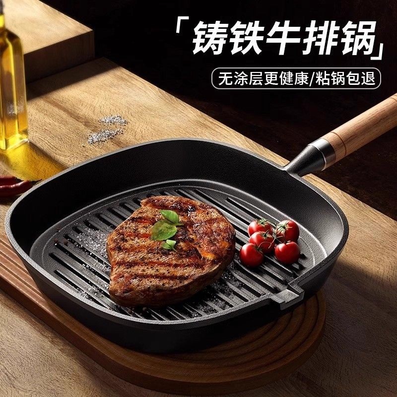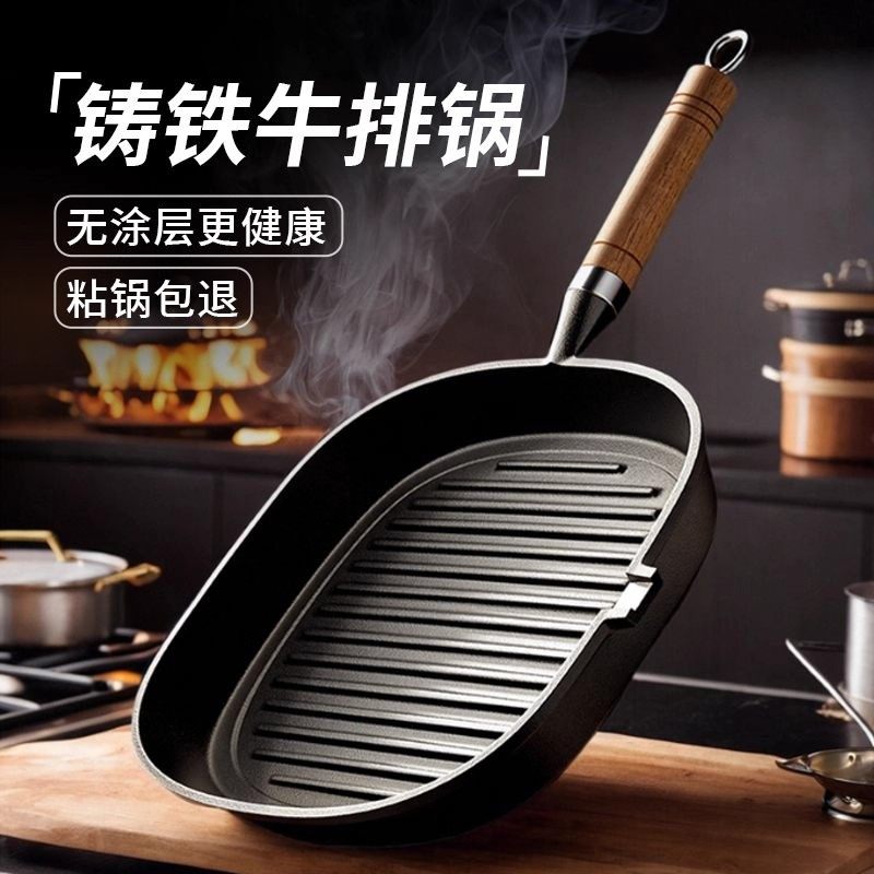 铸铁牛排煎锅无涂层平底锅家用牛扒煎盘煎牛排专用锅燃气电磁通用