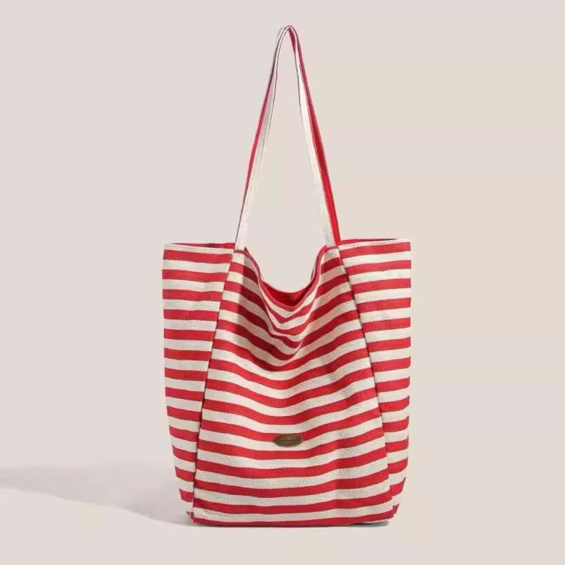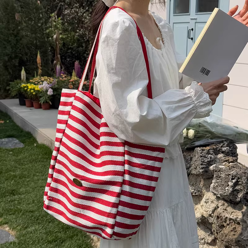 双面包帆布袋包包女式2025新款条纹韩托特包红色容量大单肩大容量