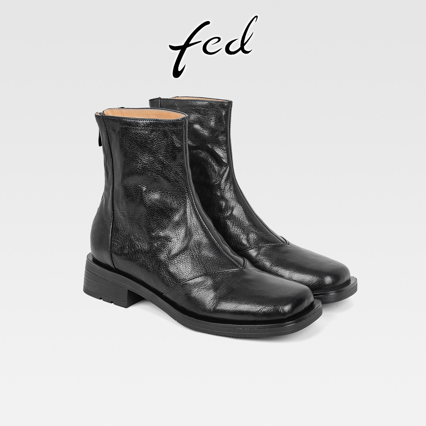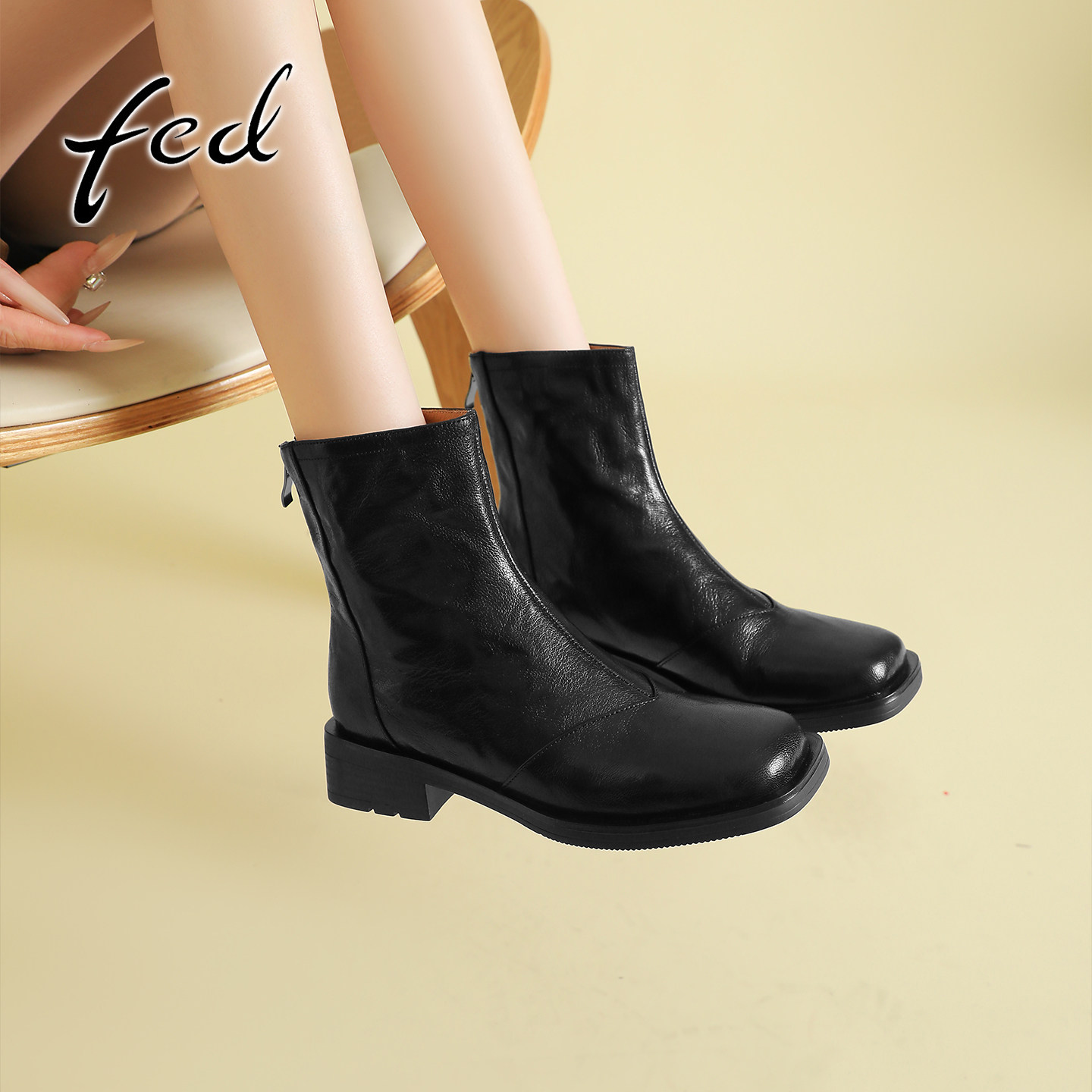 fed复古羊皮粗跟马丁靴女秋冬新款后拉链中跟方头超火瘦瘦小短靴