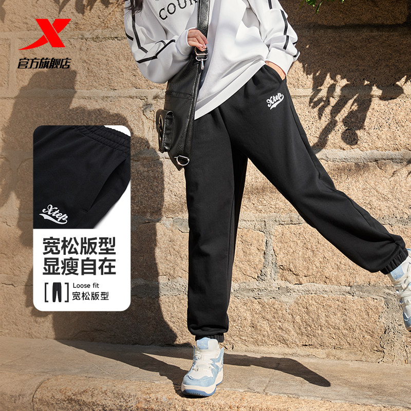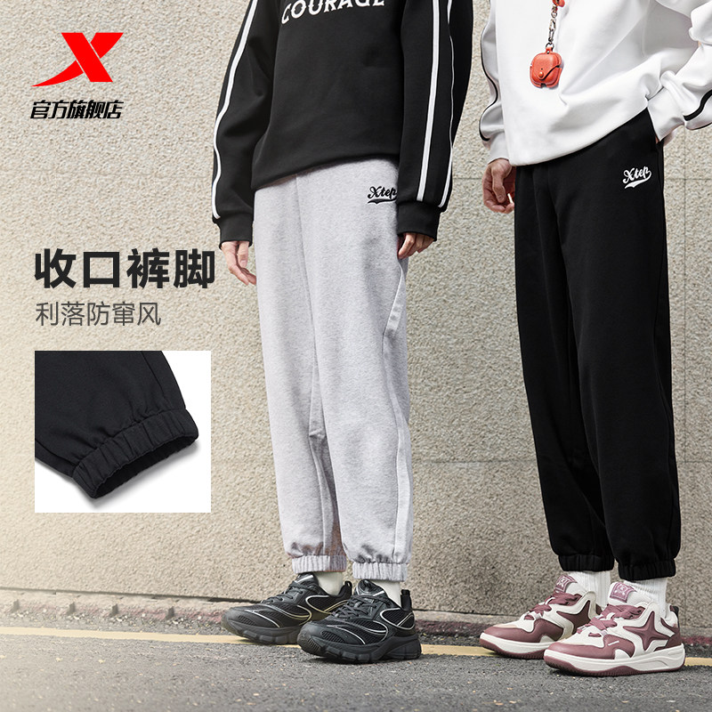 特步男女同款秋季新款宽松休闲运动显瘦束脚裤复古刺绣针织长裤