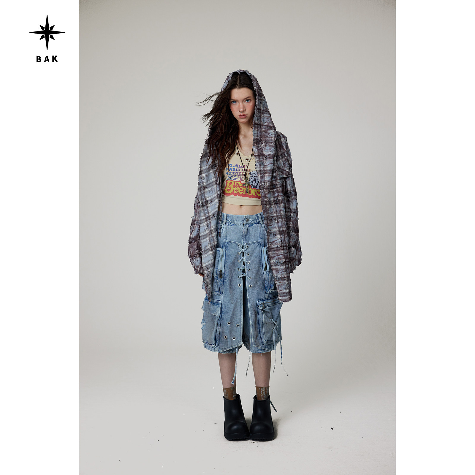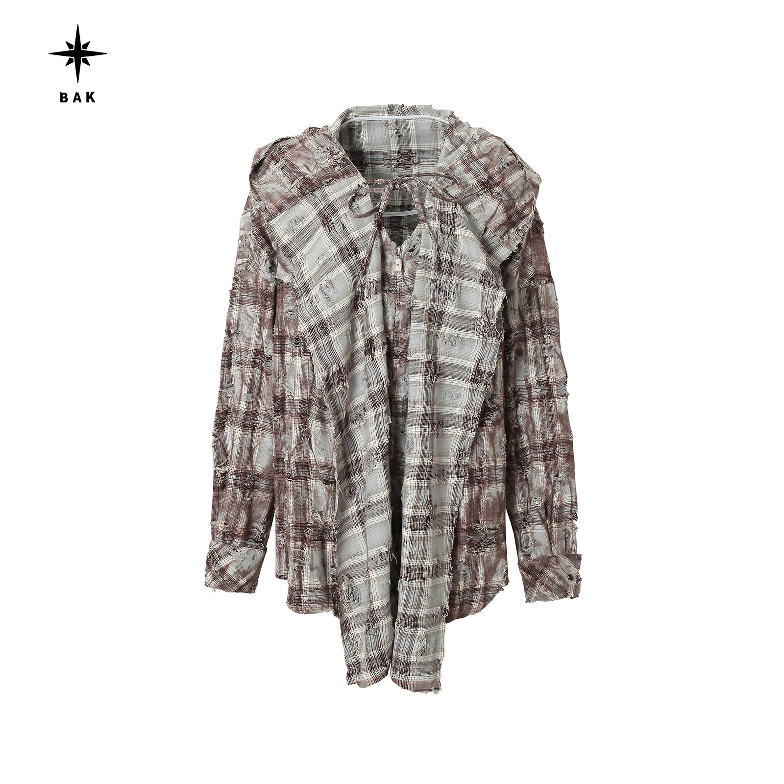 现货BAK原创 宽松复古格子外套破洞水洗做旧裤裙防晒连帽衬衫上衣