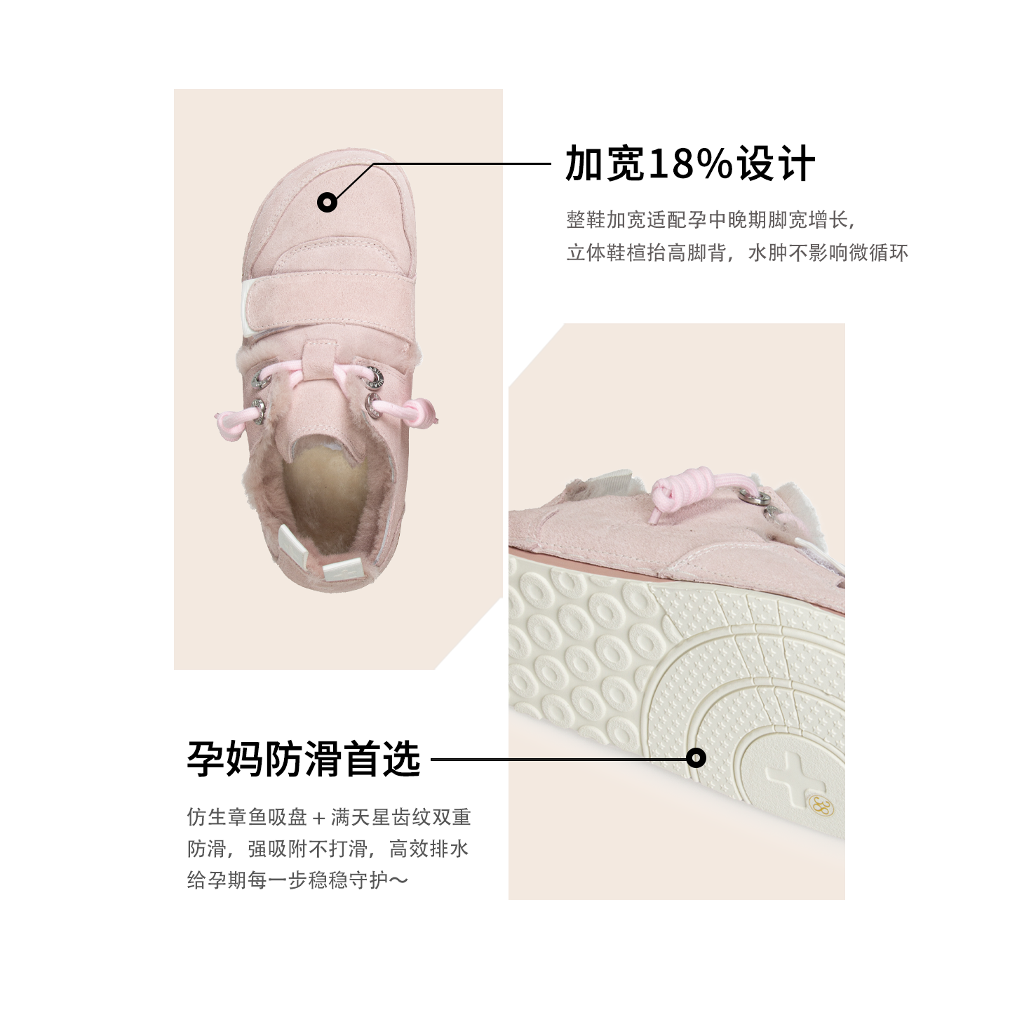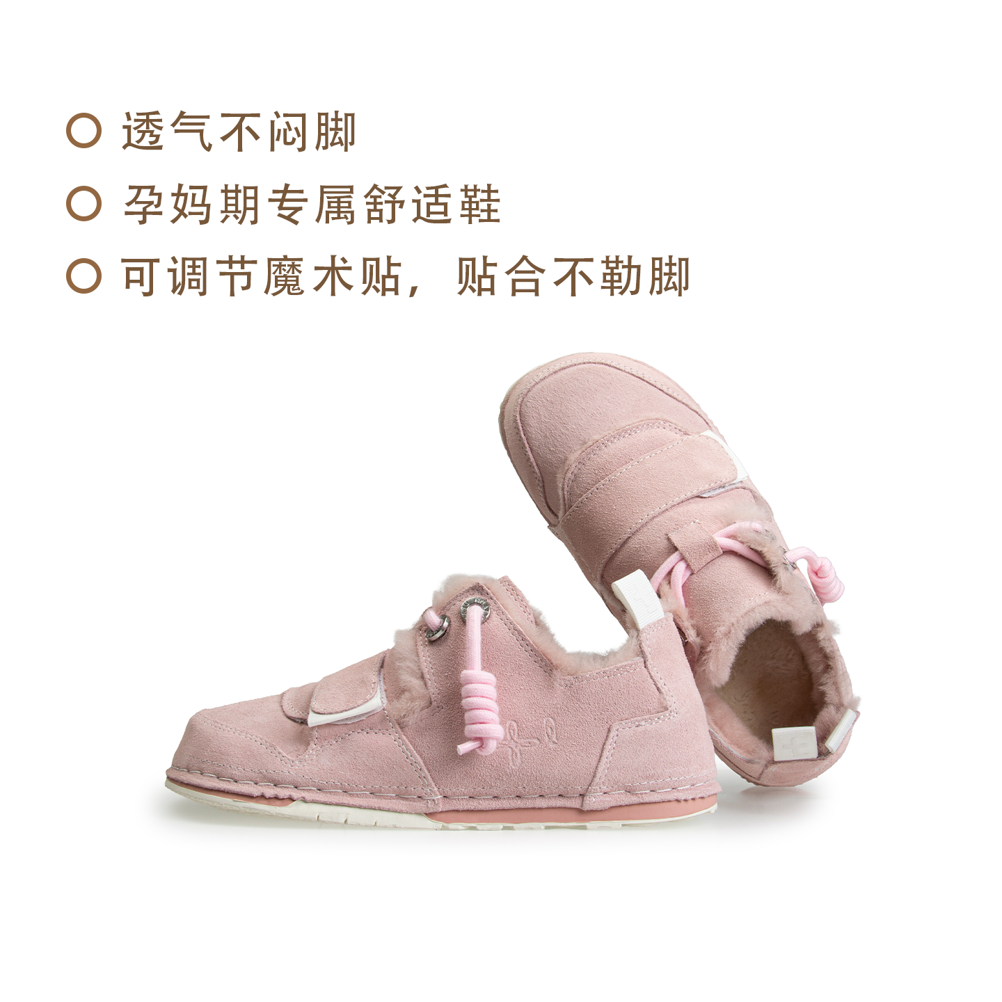 THEMULE粉色丑萌勃肯鞋反绒皮魔术贴雪地靴女羊皮毛一体防滑孕妇