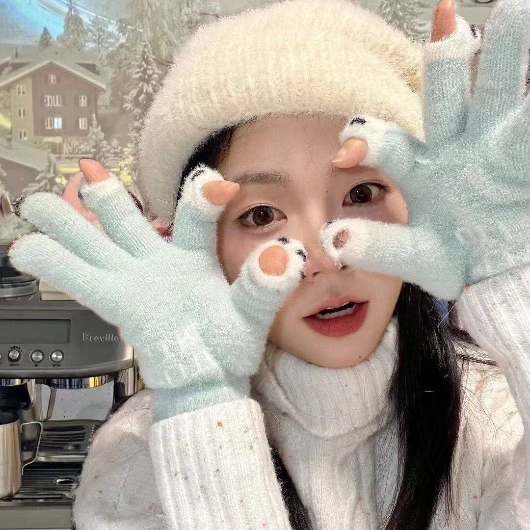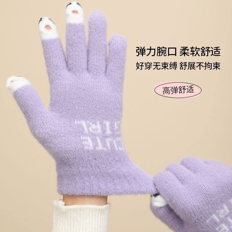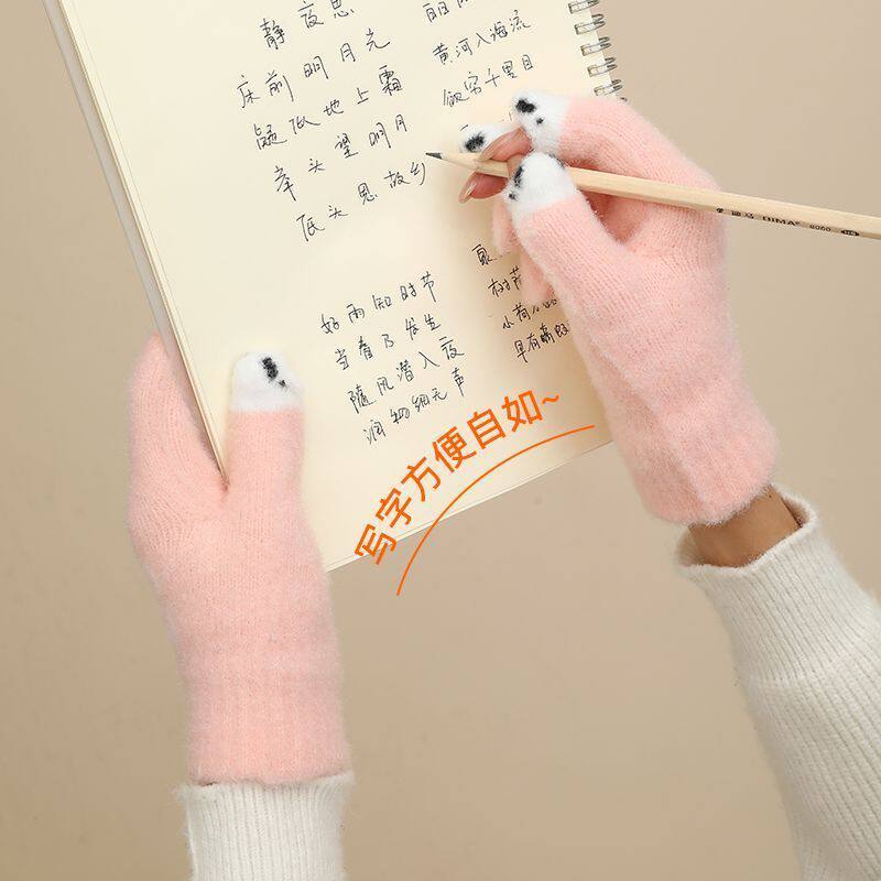 手套女士新款毛线露指加厚保暖大童可爱学生写字防寒分指触屏手套