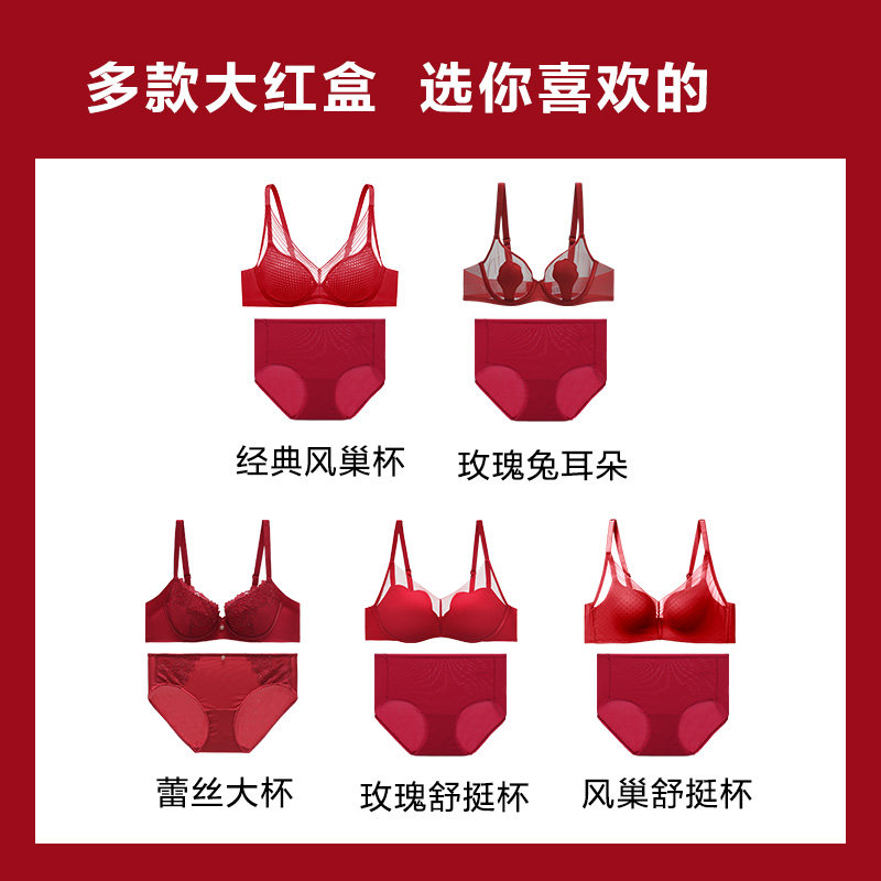红色结婚内衣内裤新娘新郎套装情侣袜陪嫁礼盒小胸聚拢加厚文胸