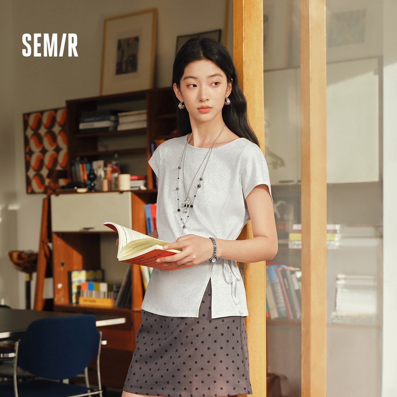 森柔|森马T恤女夏季一字领蝴蝶结开叉分割纯棉2026新款温柔系上衣