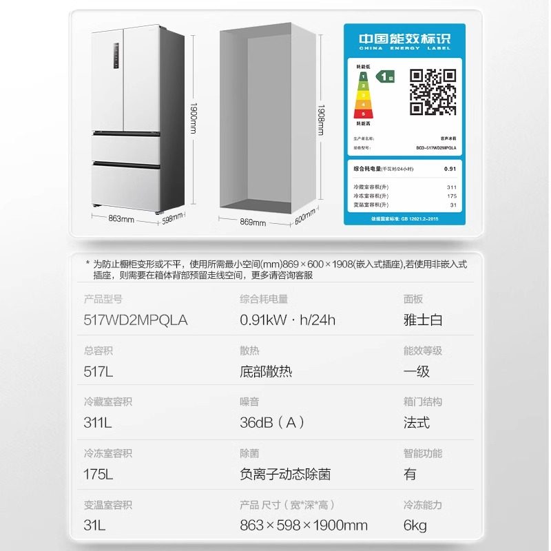 双系统|美的M60冰箱541超薄零嵌入十字双开门大容量变频520姐妹款