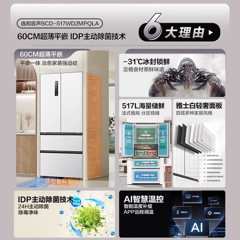 双系统|美的M60小机皇520超薄零嵌入式冰箱家用法式多门四门双开