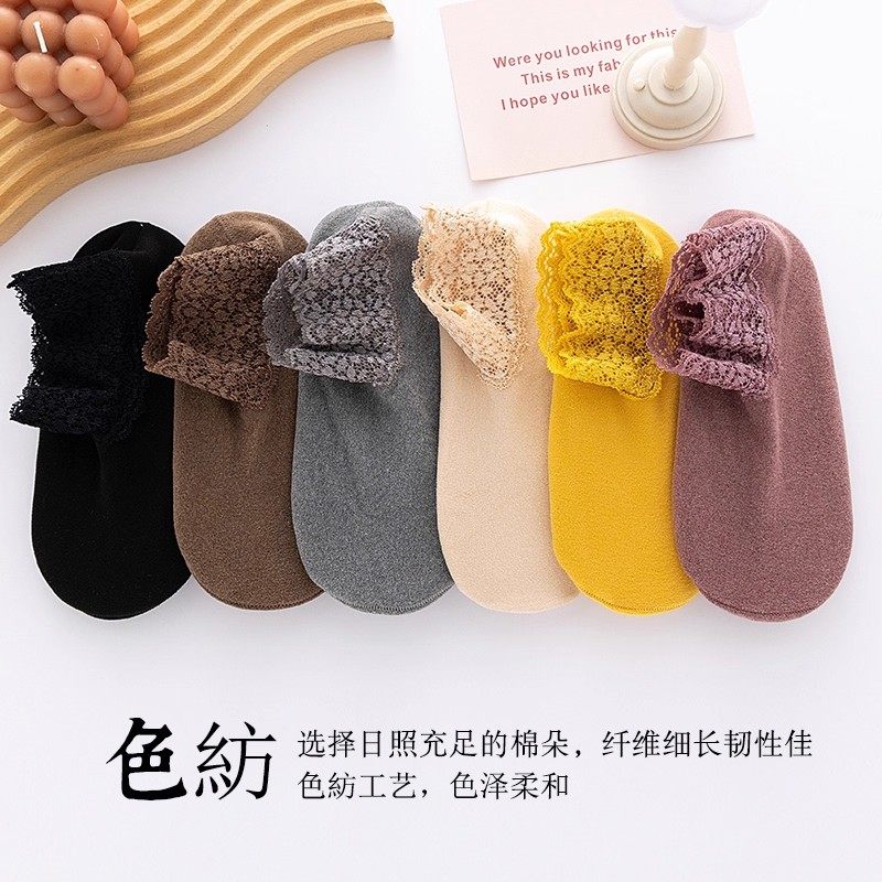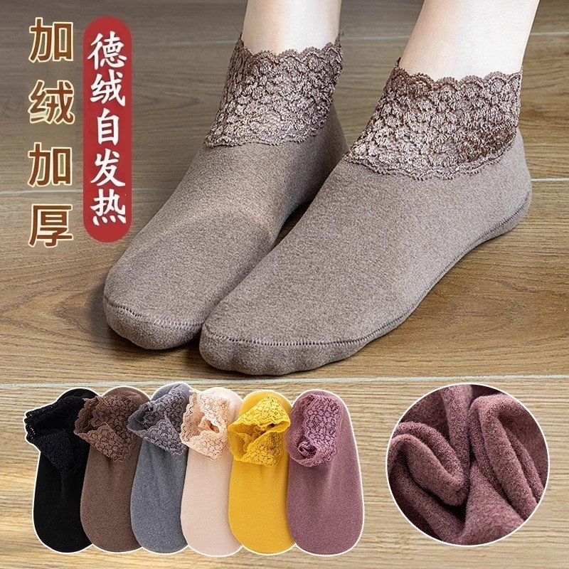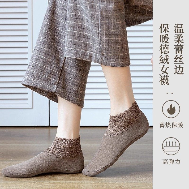 秋冬加厚袜子德绒蕾丝花边短袜女士镂空保暖防滑硅胶船袜短筒脚底