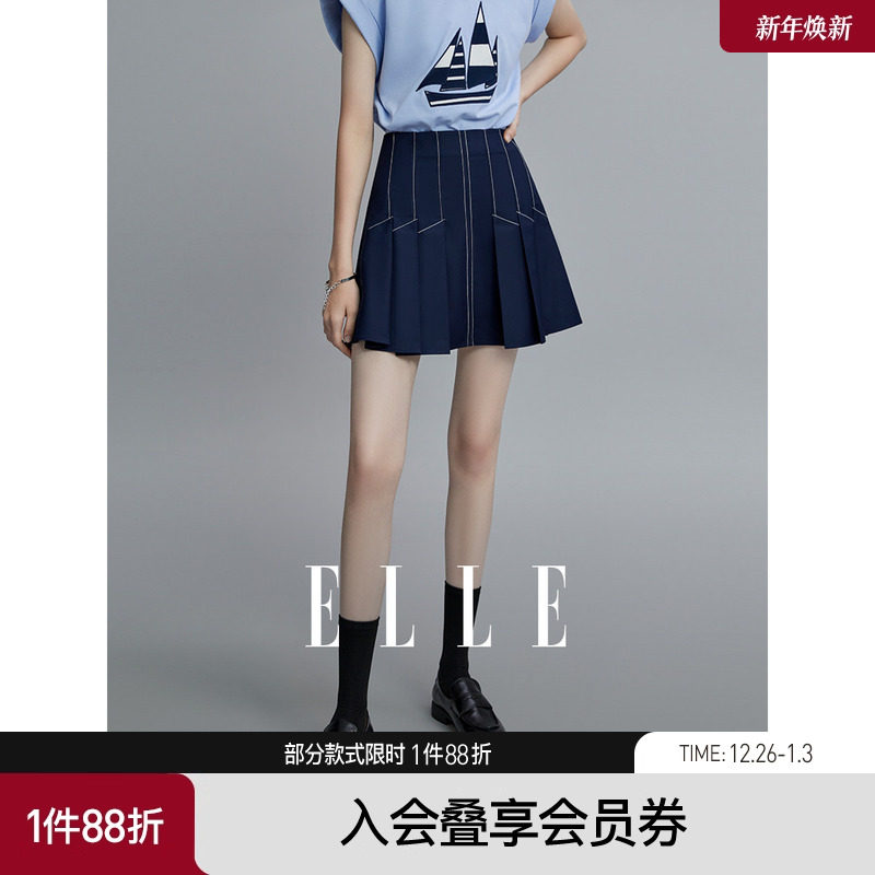 ELLE设计感百褶高腰A字半身裙女2025夏装新款小个子气质显瘦短裙