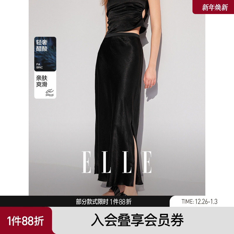 【醋酸】ELLE黑色设计感长款半身裙女2025夏季新款高腰开叉鎏光裙