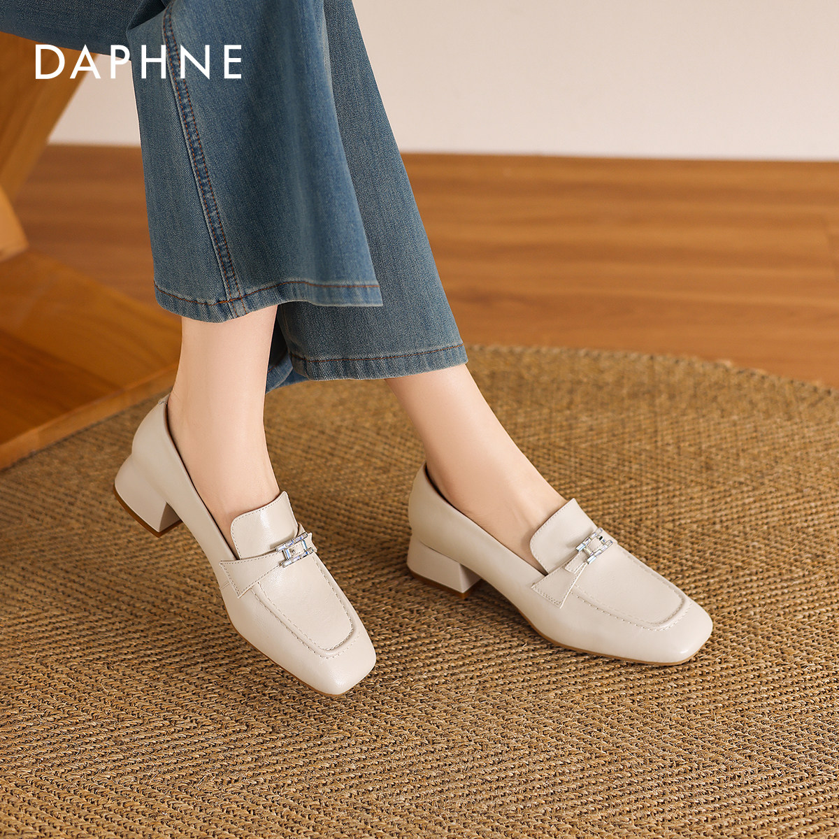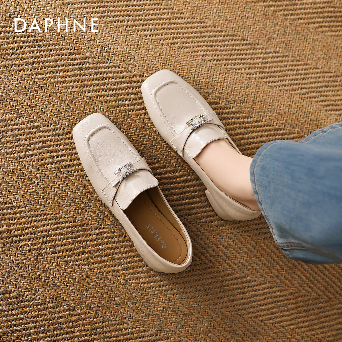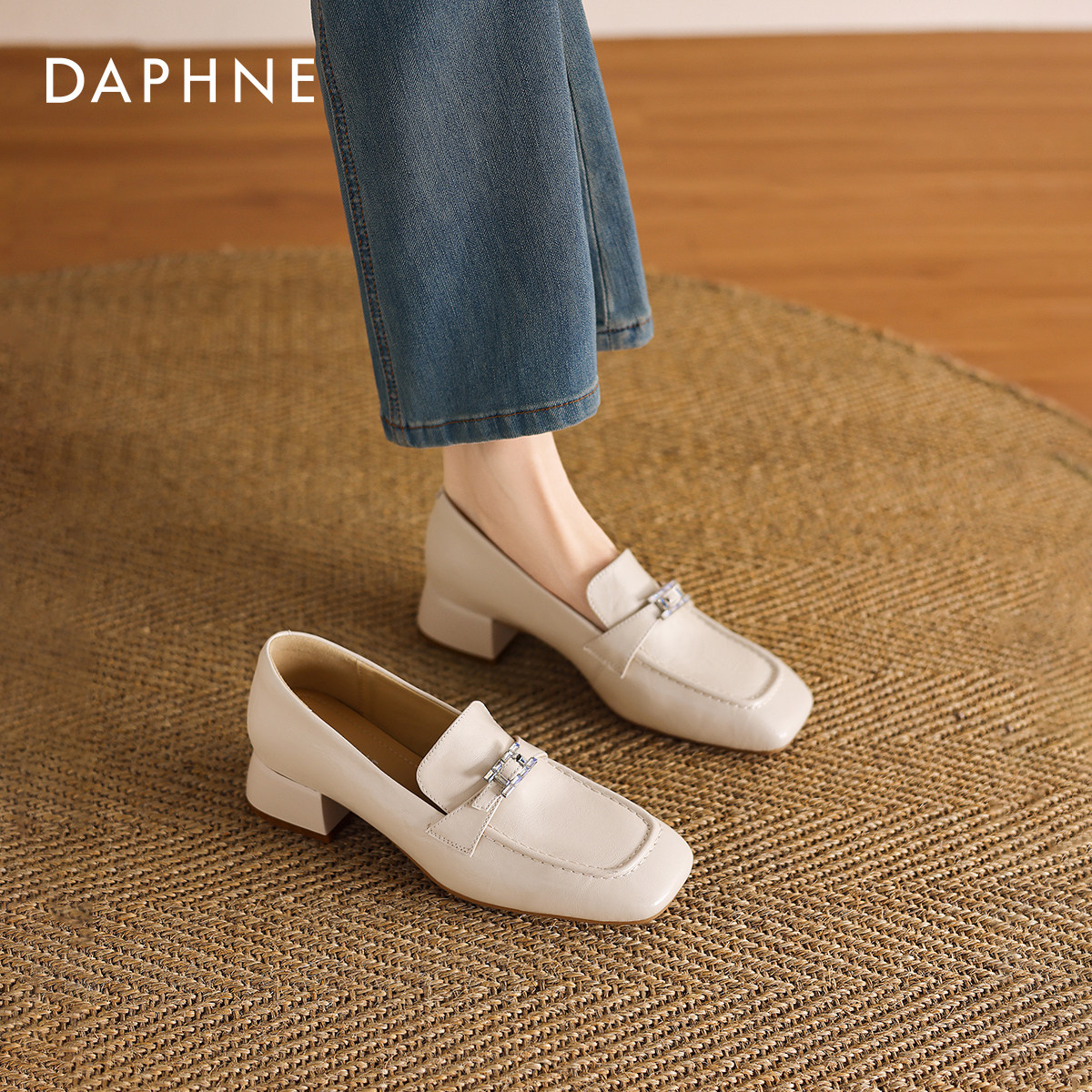 达芙妮白色方头乐福鞋女款2026新款春季英伦风巨好看小皮鞋豆豆鞋