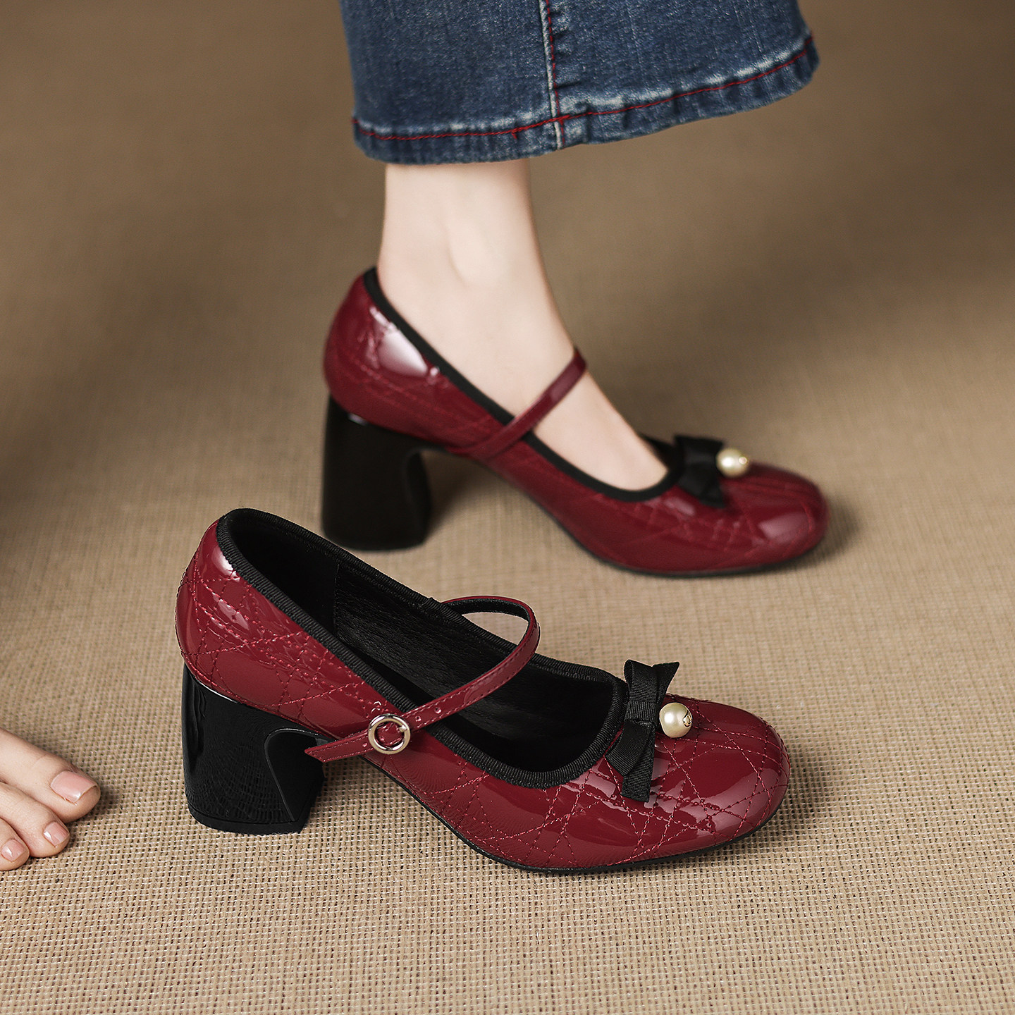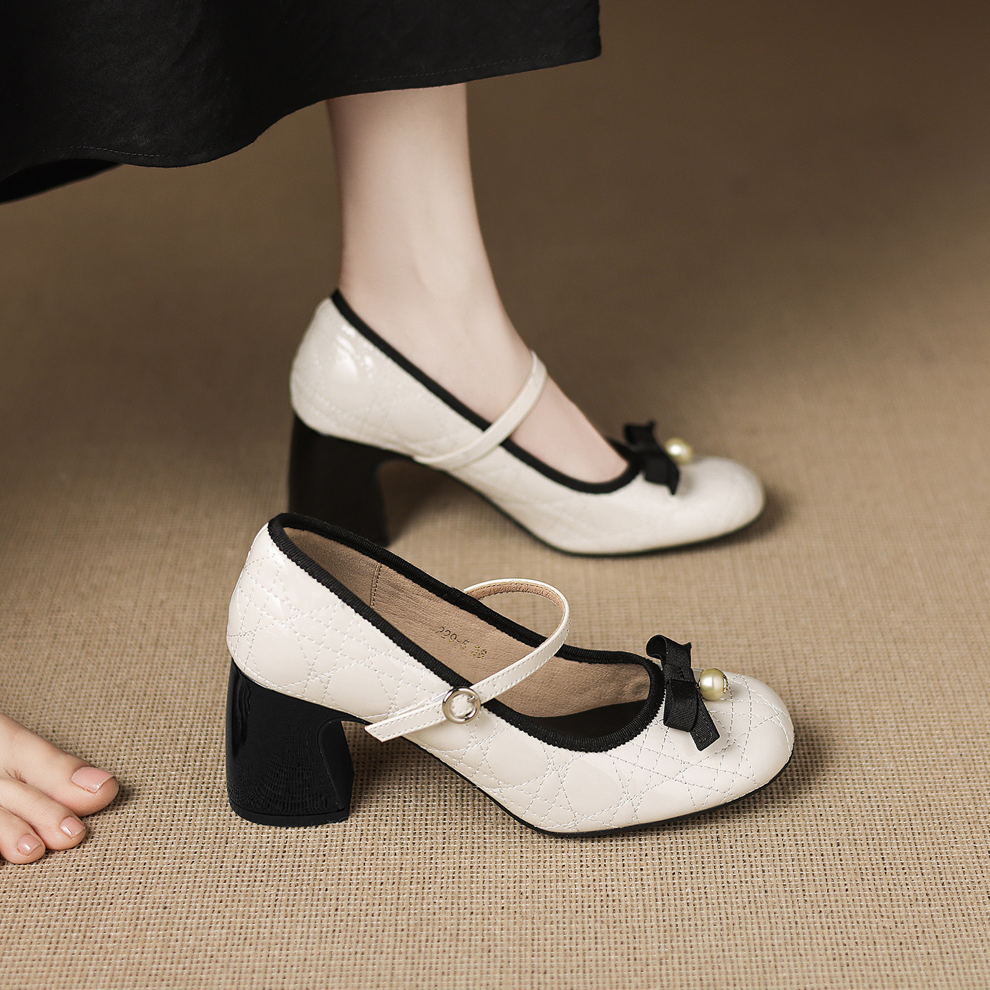 真皮~骄屿法式仙女风高跟鞋女婚鞋玛丽珍鞋珍珠系蝴蝶结粗跟单鞋
