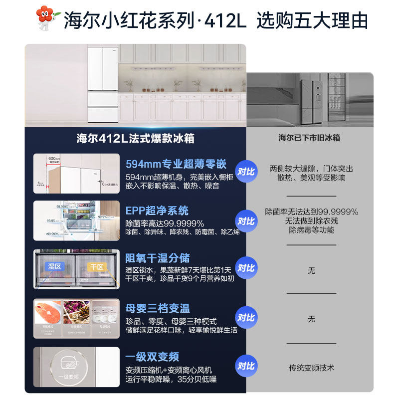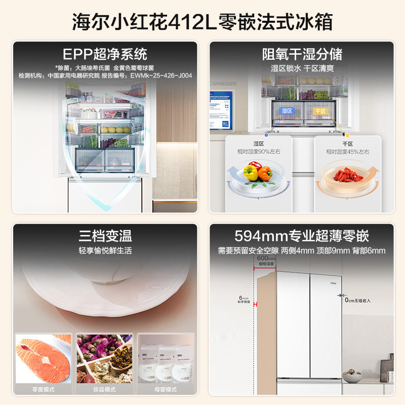 海尔小红花412L换新补贴法式双开超薄零嵌家用一级风冷冰箱官方