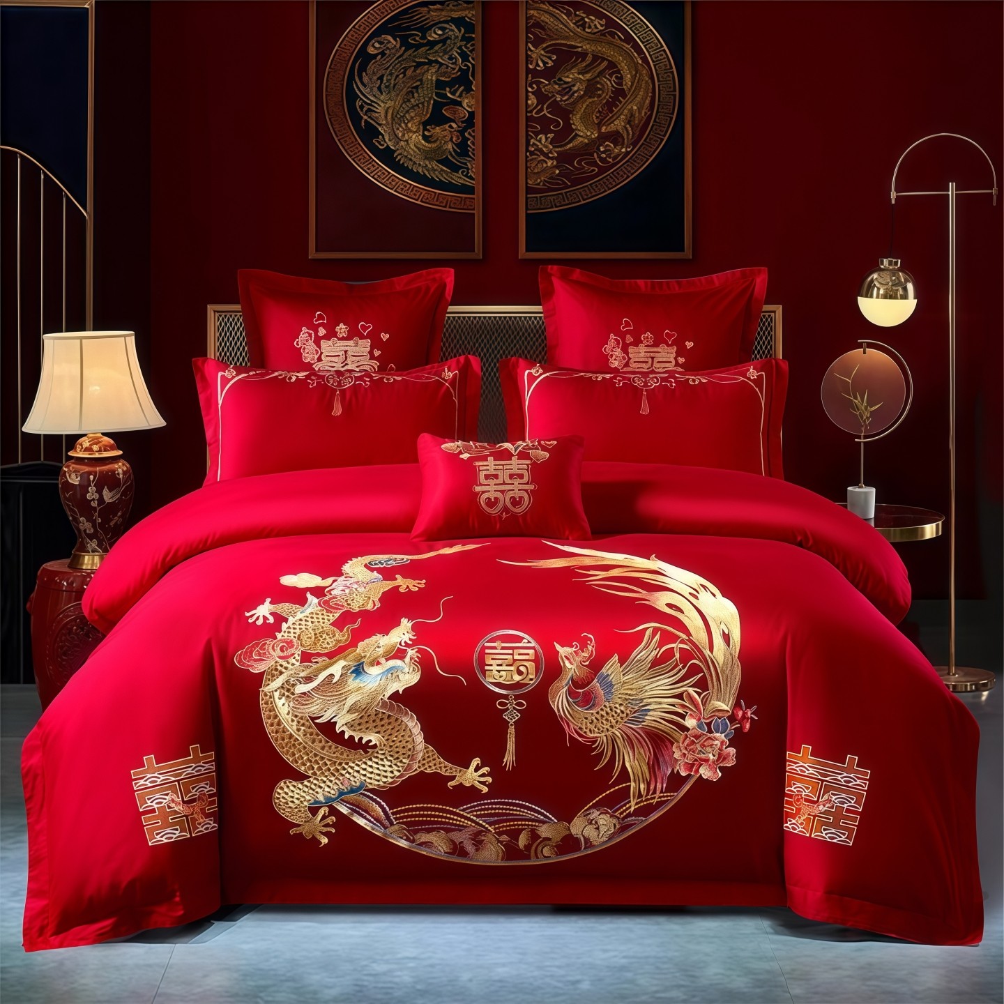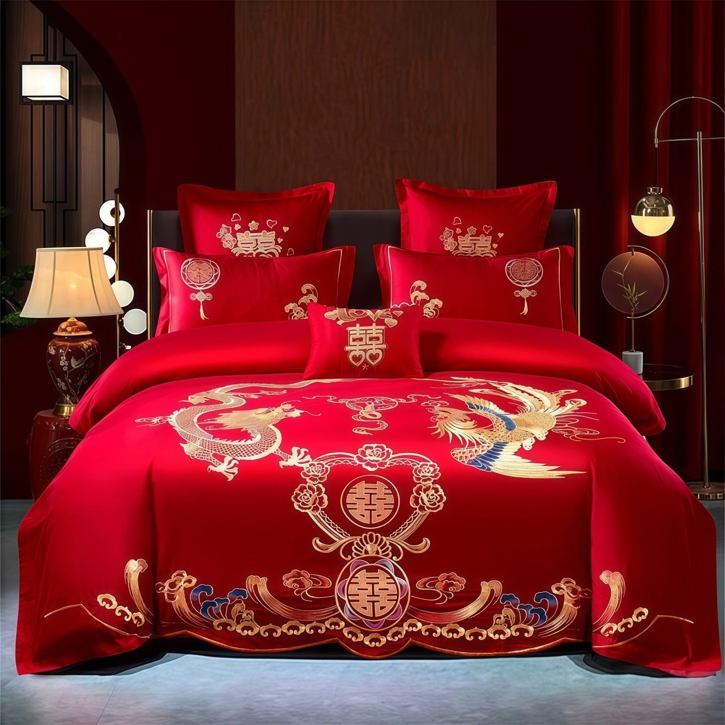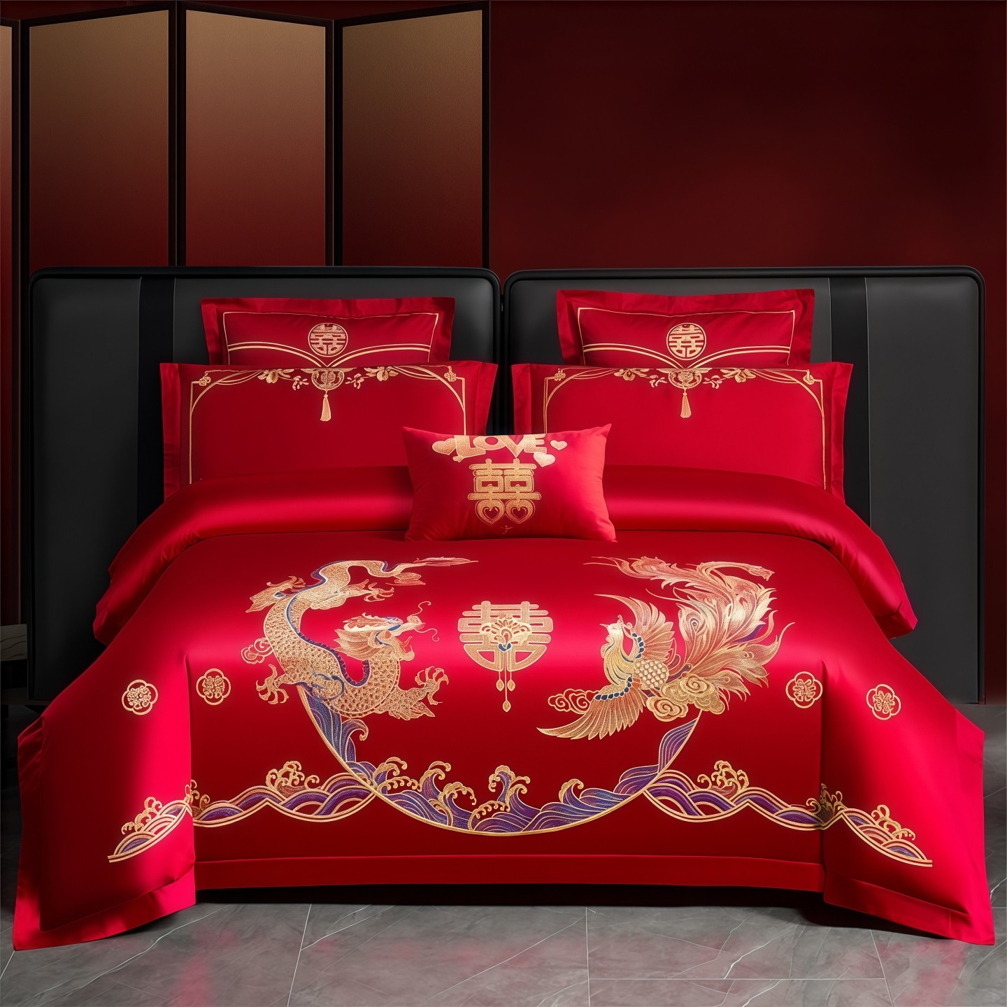 水星家纺大红色婚庆刺绣全棉四件套纯棉结婚陪嫁喜被被套床上用品