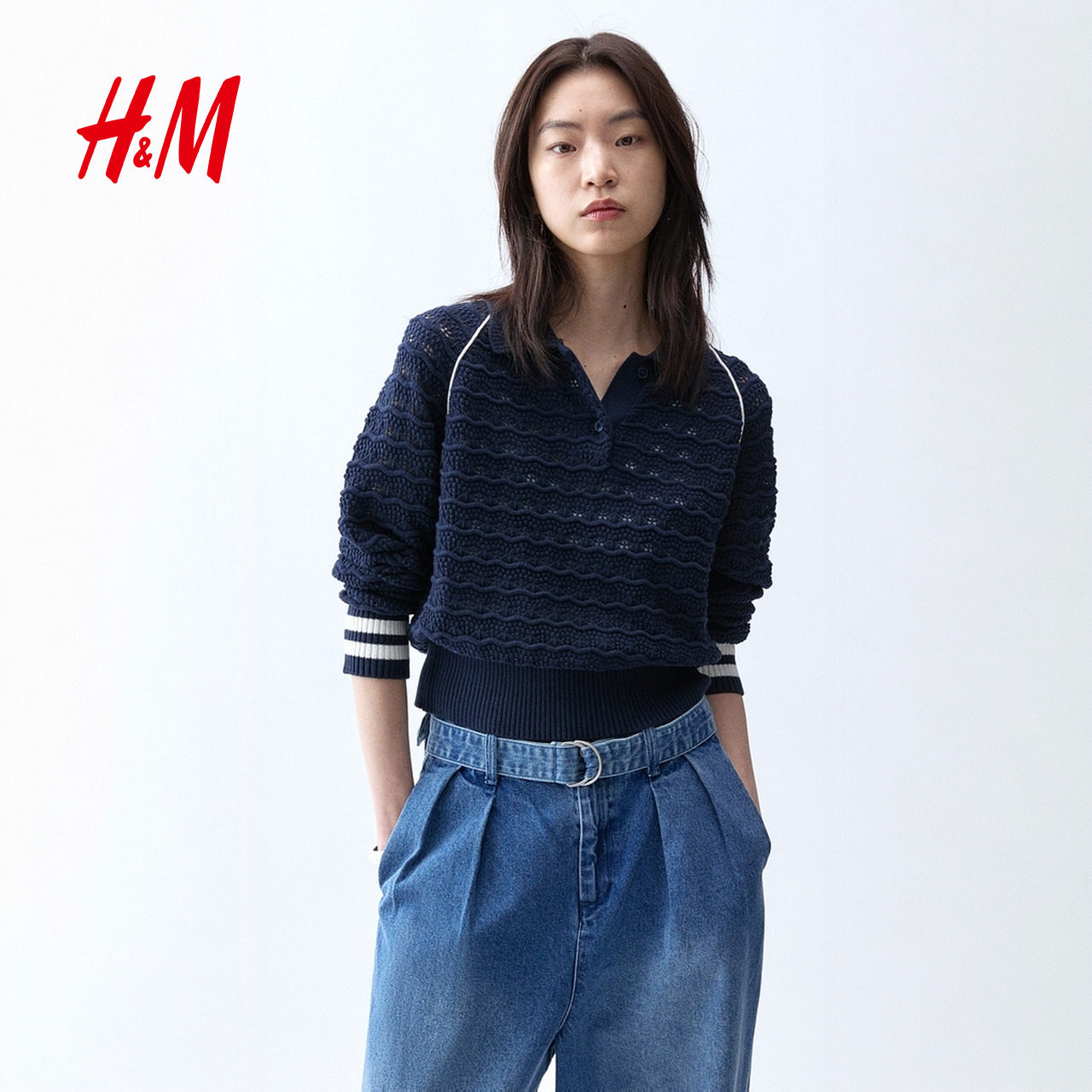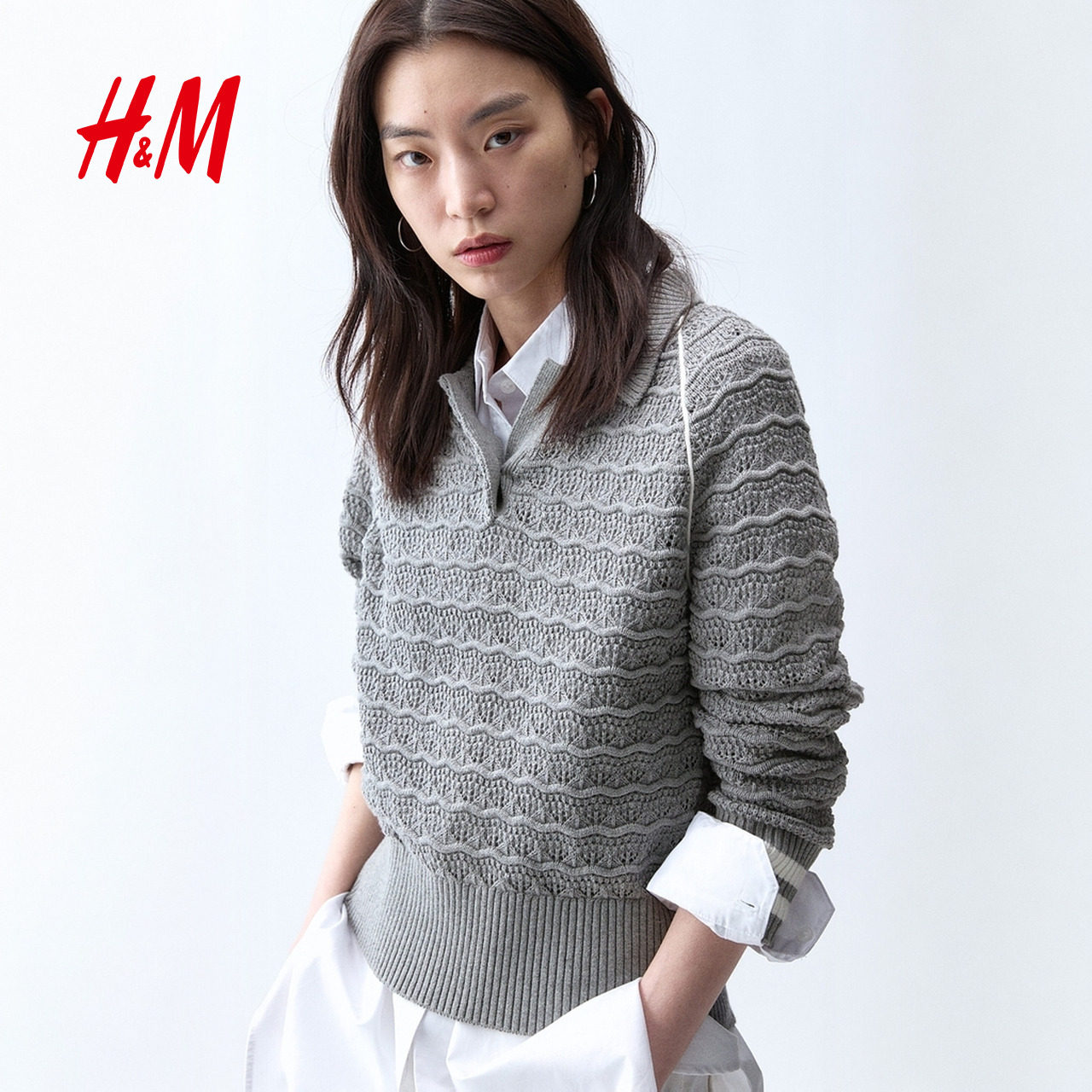 HM女装毛针织衫26春季新款休闲透气网眼针织Polo套衫上衣1326982