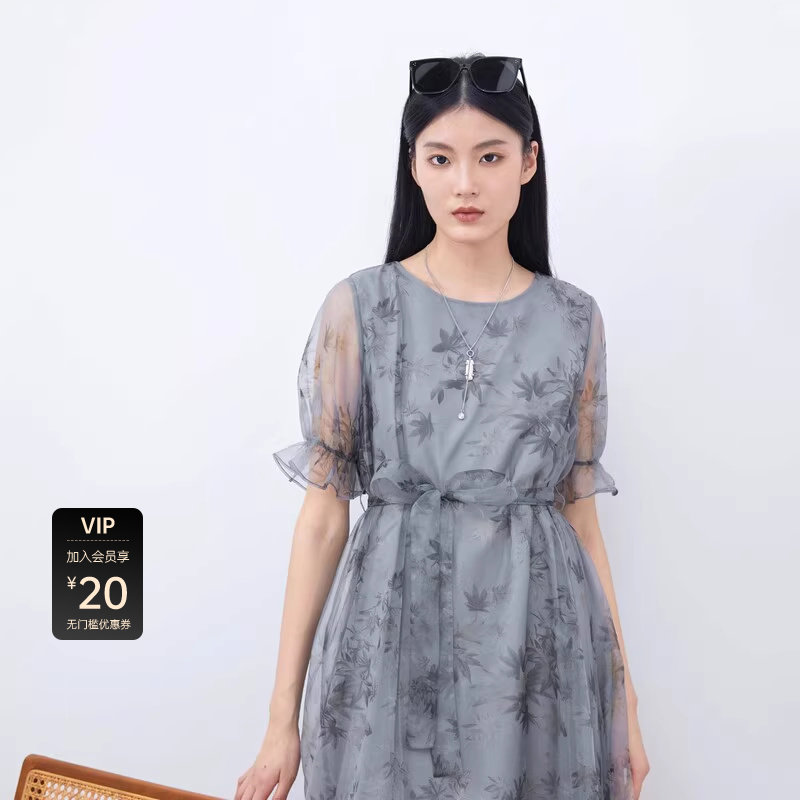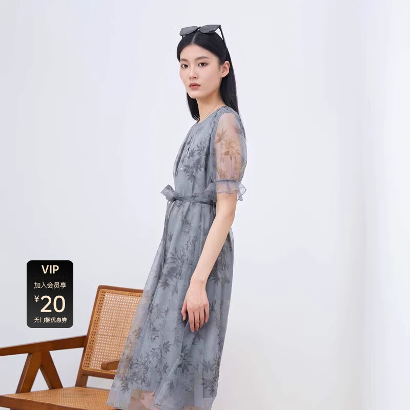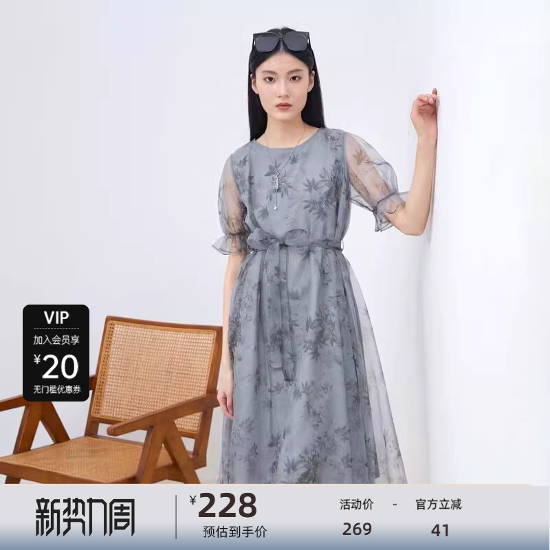 sdeer圣迪奥女装圆领收腰印花泡泡袖连衣裙S23261231