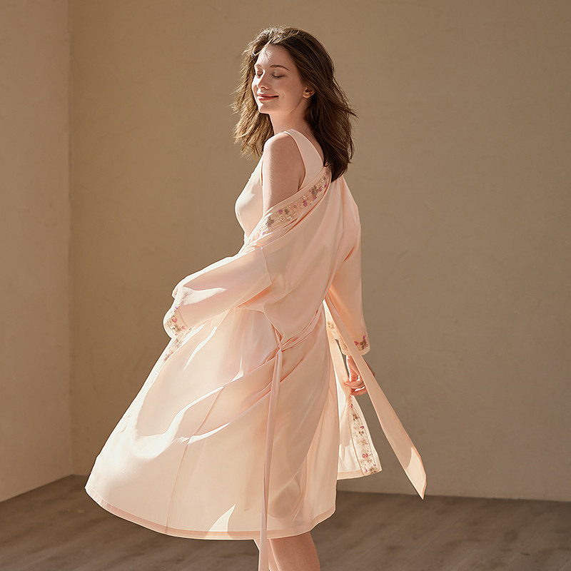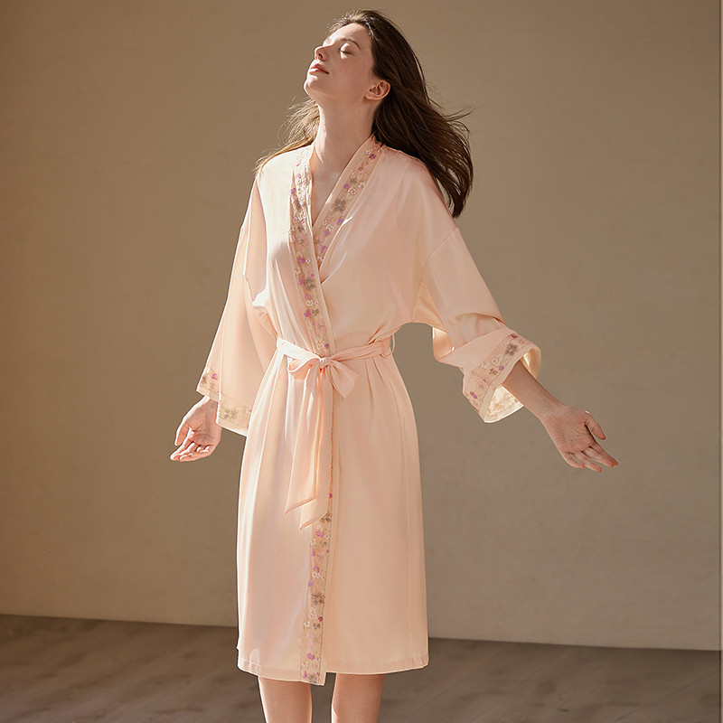 曼妮芬女士性感蕾丝刺绣睡袍中长款外披浴袍家居服舒适