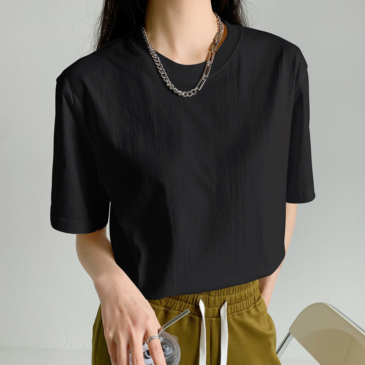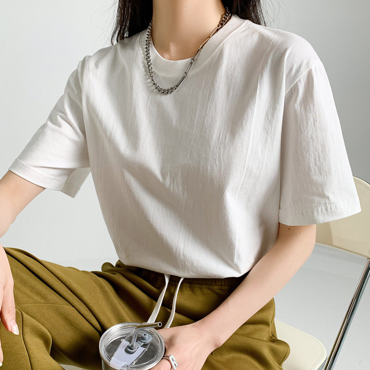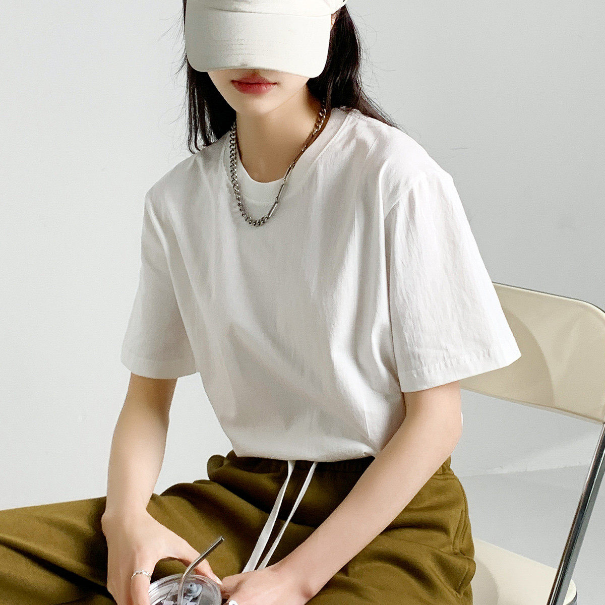 one more新款纯棉短袖宽松港风纯色圆领T恤女夏季休闲简约上衣女