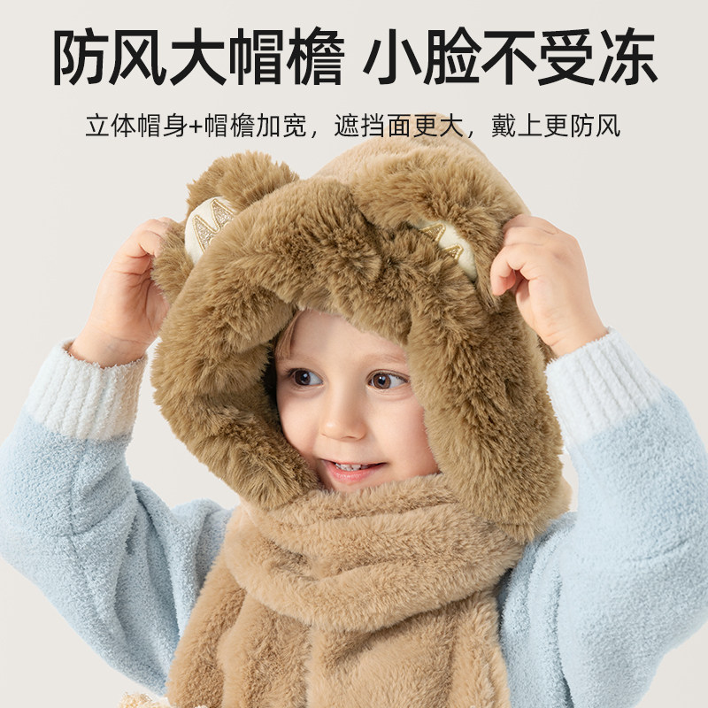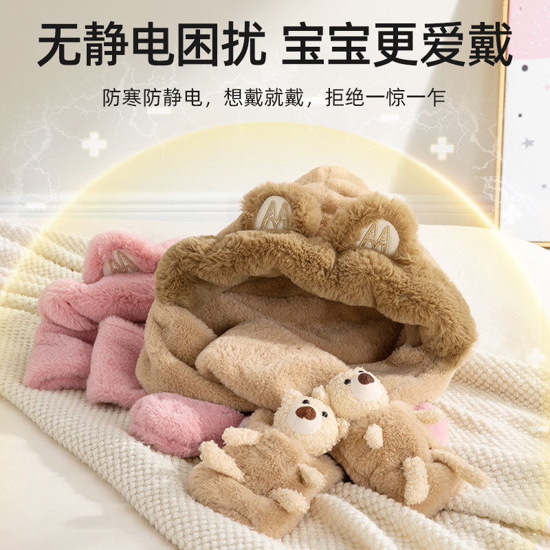 尼多熊儿童帽子围巾一体冬季防风帽宝宝毛绒护耳帽女童加厚保暖帽