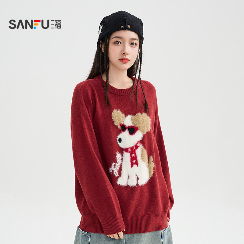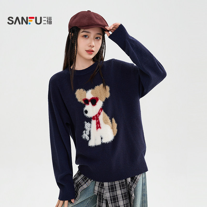 三福毛衣慵懒高级感2025新款冬季可爱毛绒小狗宽松上衣女装509727