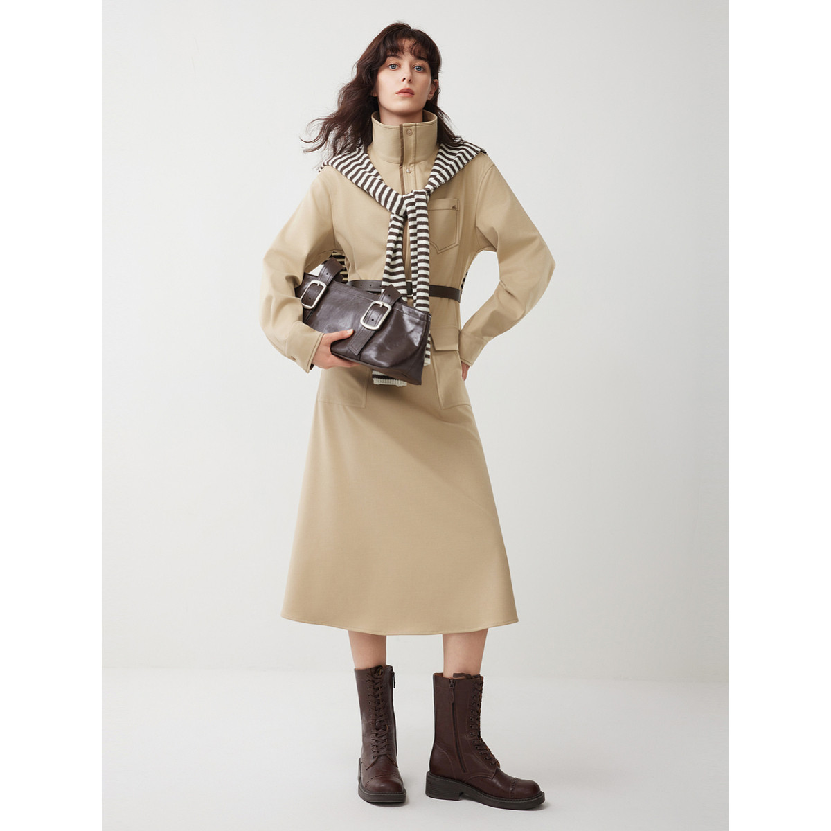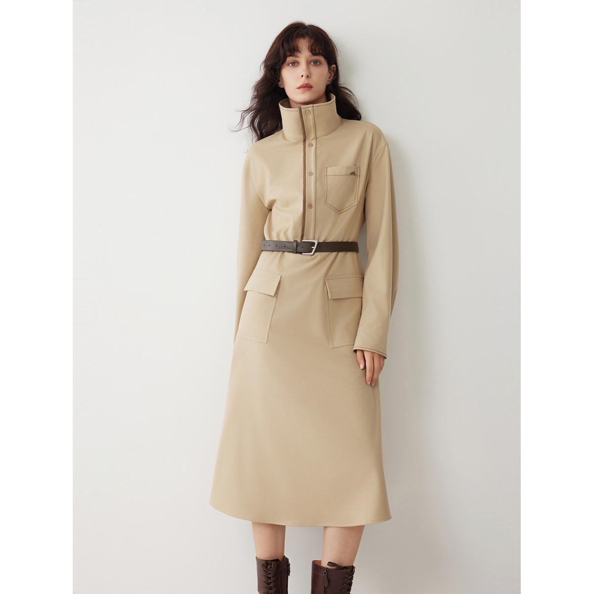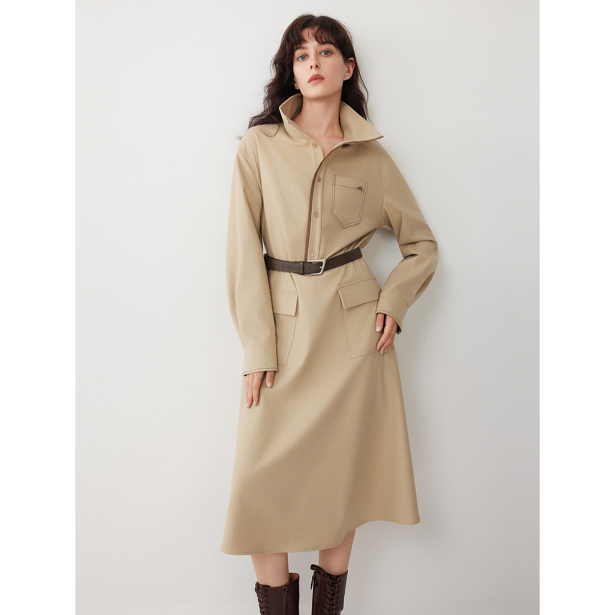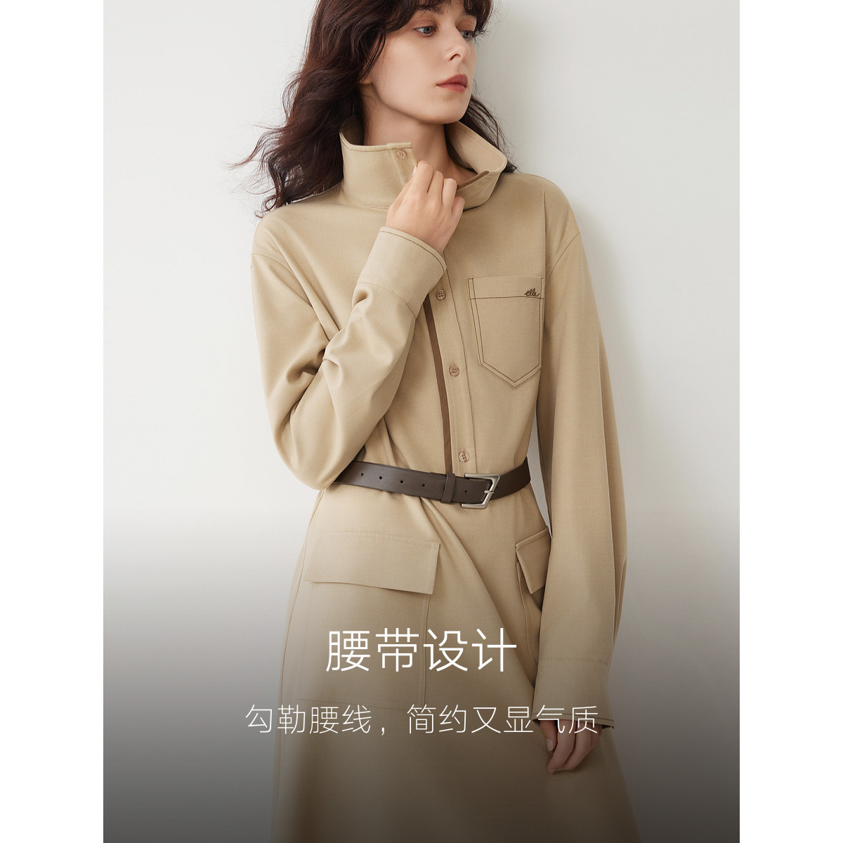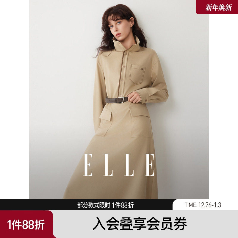 ELLE卡其色高级感衬衫式连衣裙女2025冬季新款设计感休闲通勤长裙