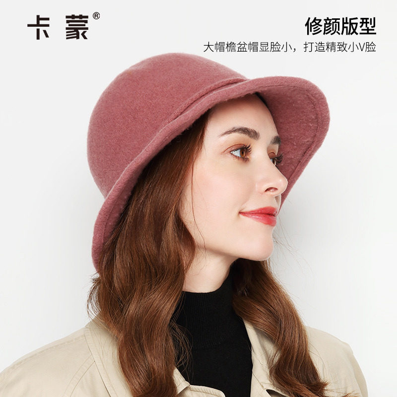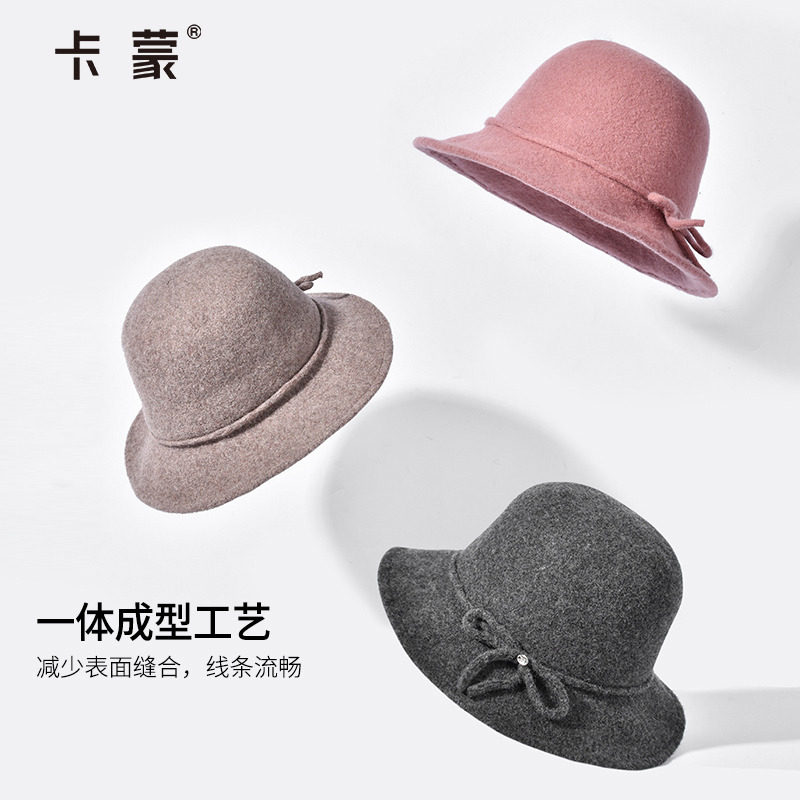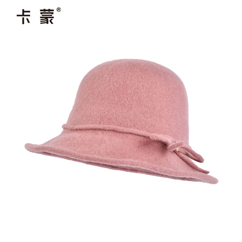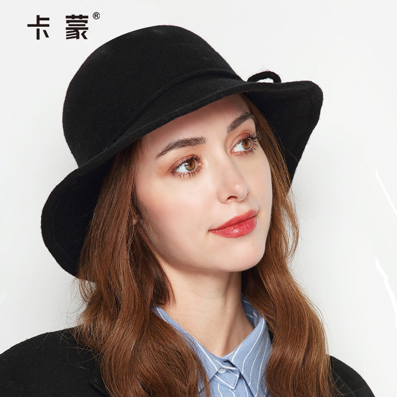 卡蒙英伦蝴蝶结圆顶礼帽女士秋冬季纯色保暖宽檐羊毛盆帽毛呢帽子