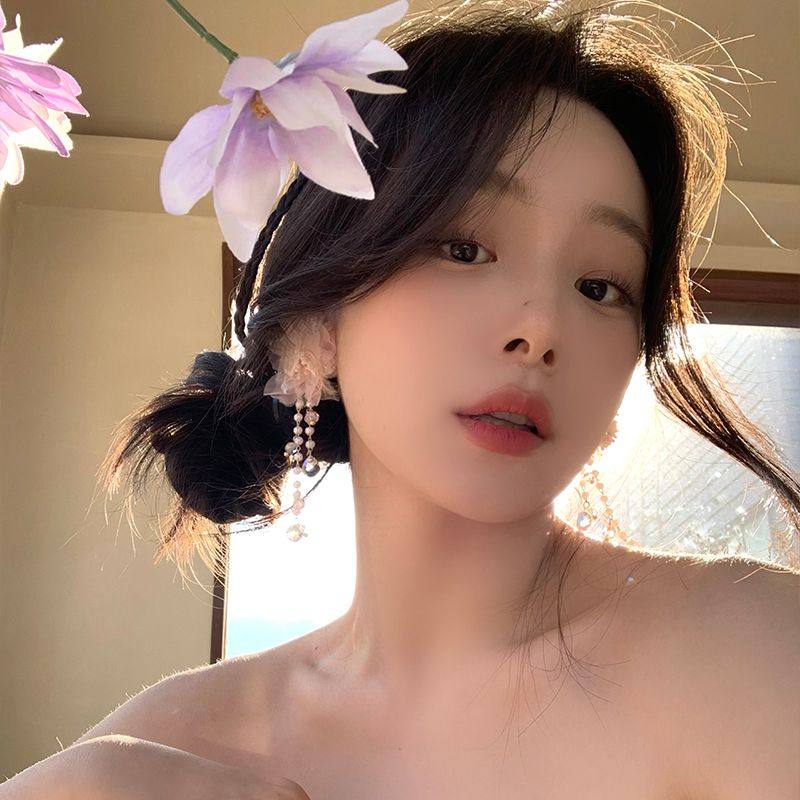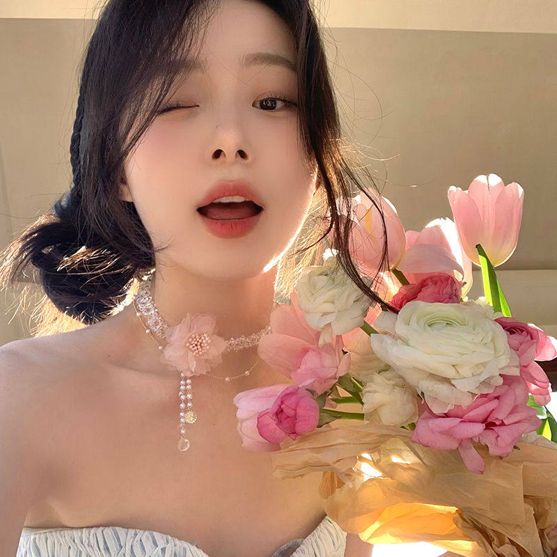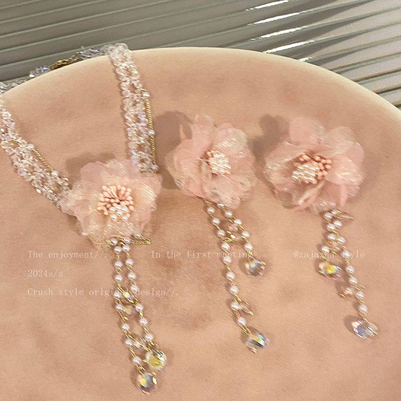 甜美粉色花朵流苏项链珍珠锁骨链轻奢小众高级氛围感水晶颈链项饰