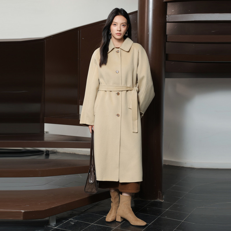 AIRIQI冬季新款休闲小翻领单排扣系带全羊毛双面呢大衣AZ44DY110